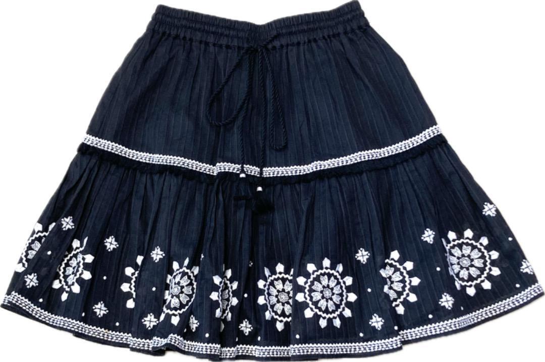 ■ウエストゴムにタッセル付きドローコード、腰フリンジ切り替え、切替下ギャザー、ストライプ織地がクレープ生地のような風合いで裾刺繍の可愛いギャザースカートです。