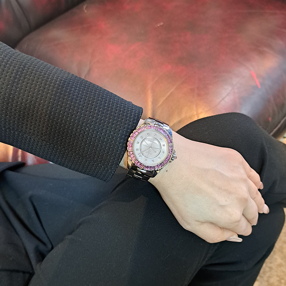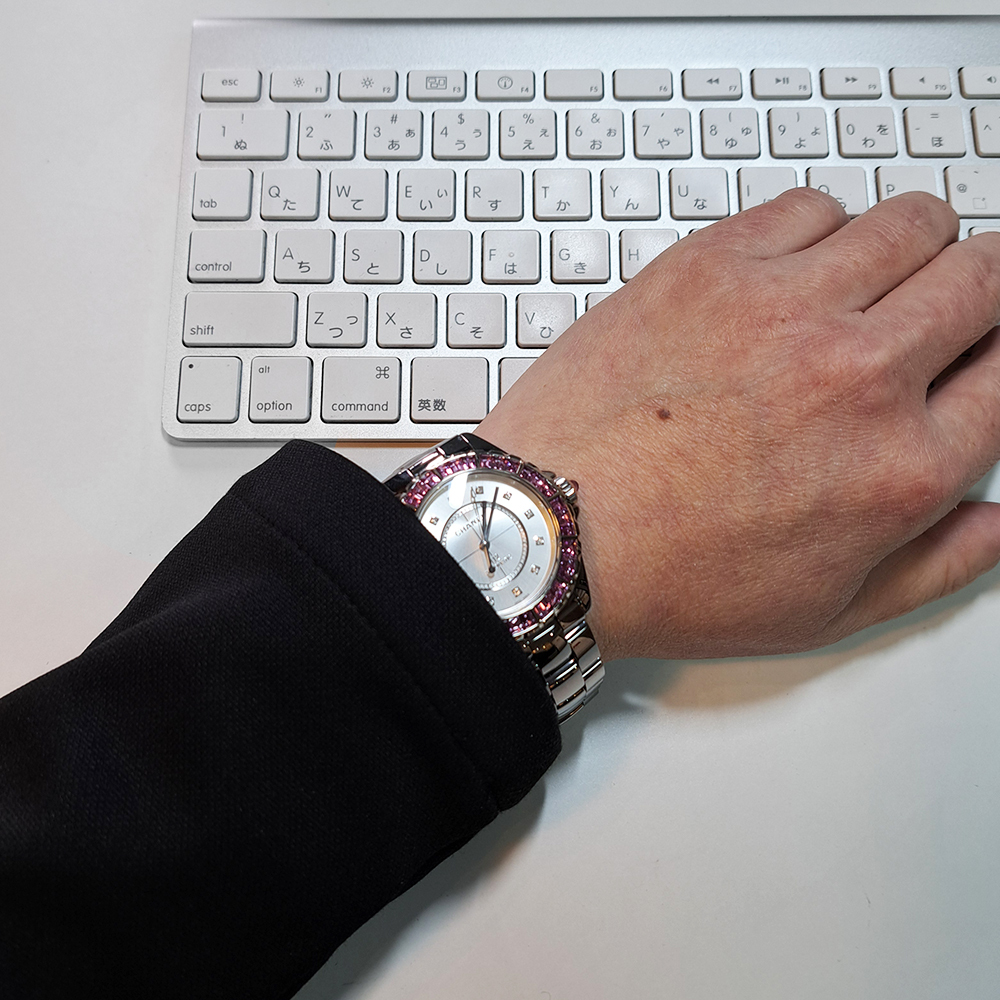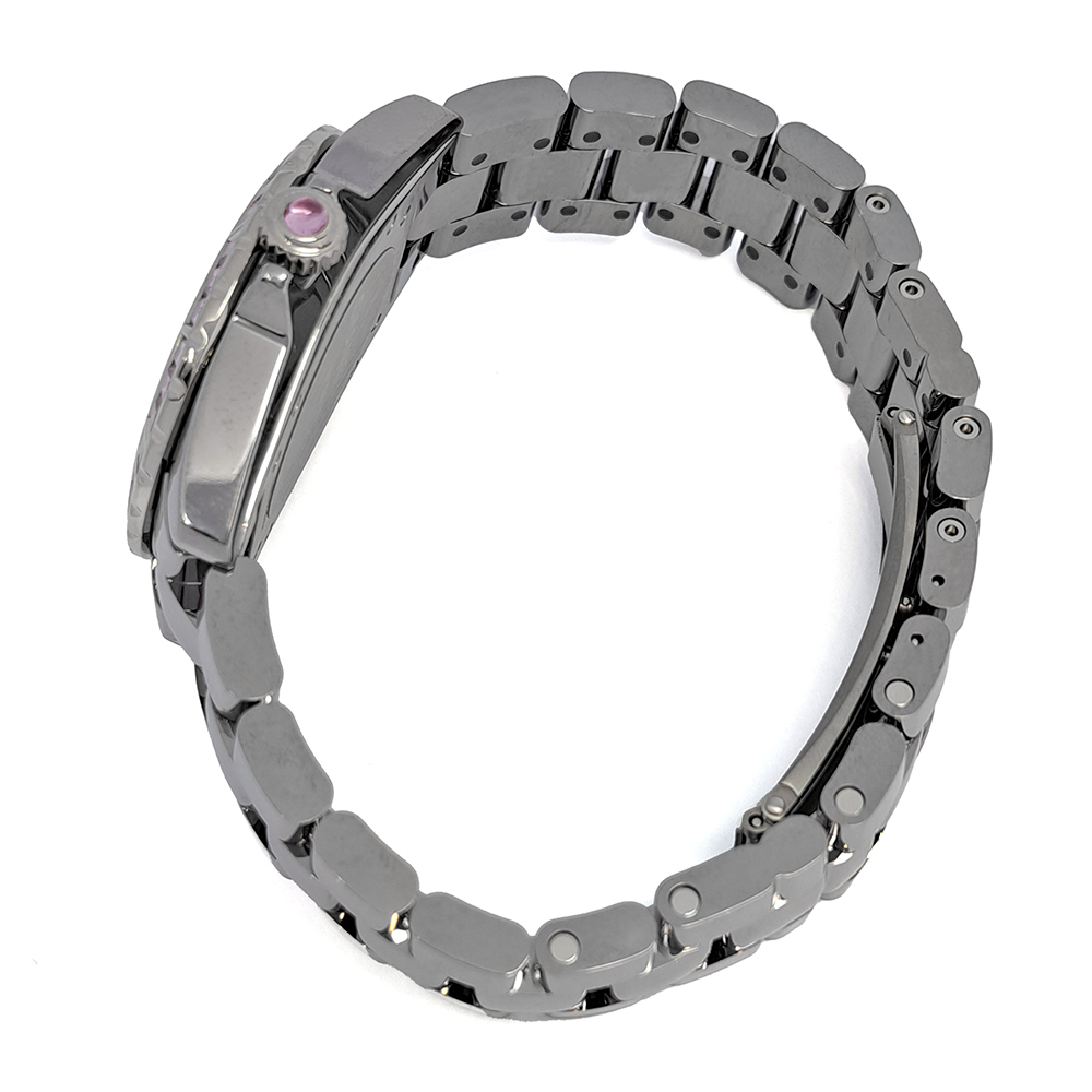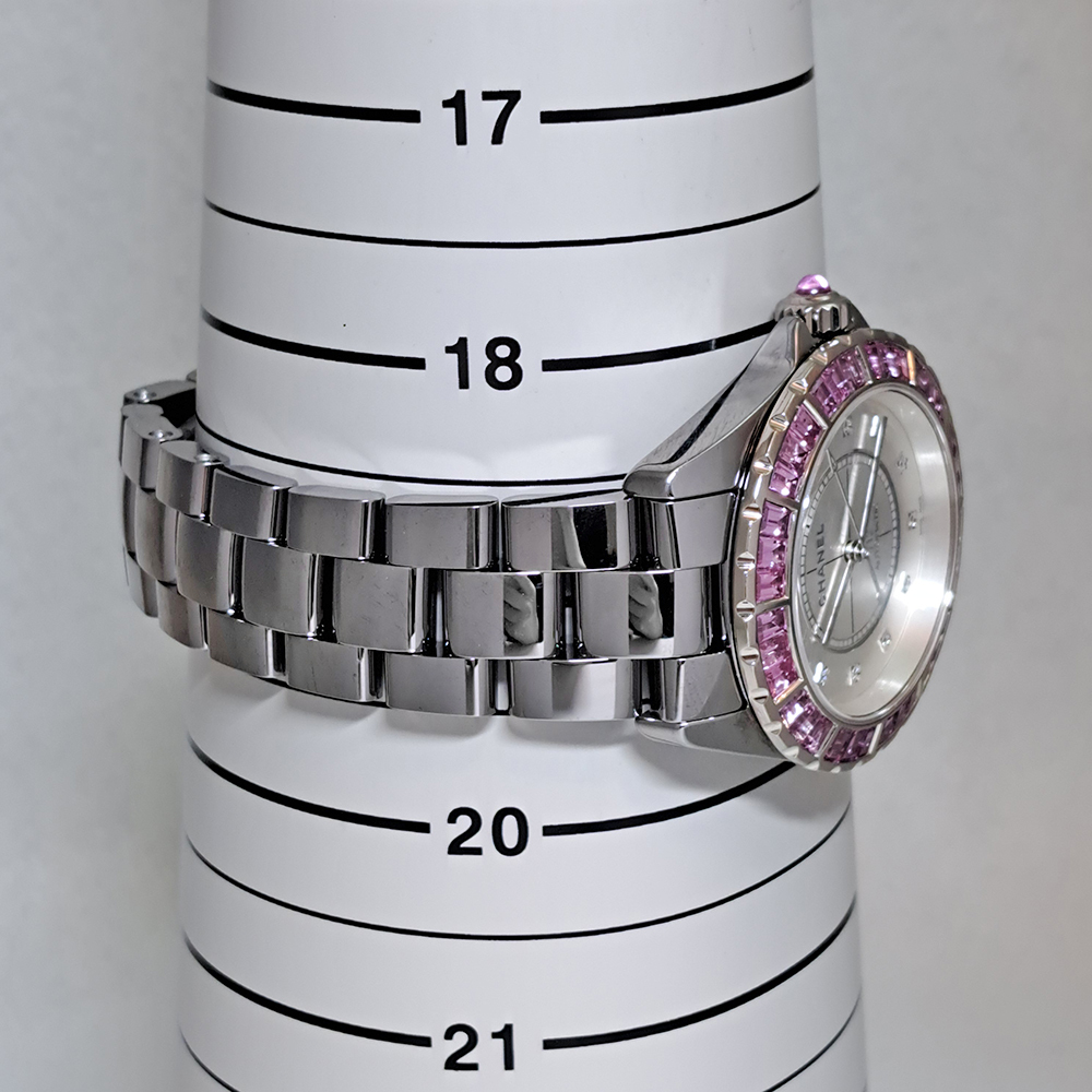 コメント | シャネル J12 H3295 ピンクサファイアベゼル が入荷致しました。強度に強い美しいセラミックチタンにベゼルにはホワイトゴールドに36個のバケットカットのピンクサファイアをセッティングしたゴージャスな逸品です。セラミックにチタンを加えてダイヤモンドパウダーで研磨する事で独特の色と輝きを放つクロマティックシリーズはすでに生産終了しており、なかでもピンクサファイヤを取り巻いたこちらの時計は大変稀少モデルです。10倍ルーペで拡大するとピンクサファイアに極々微細なカケが御座いますが、肉眼では殆ど確認出来ない程度で、それ以外は目立った傷等の無い綺麗な状態です。ギャランティに2013年には購入した記載があります。 ~出品担当の中村より~ ピンクサファイアベゼルの可愛らしいモデルで、大き目のサイズがお好みの女性にもお勧めです。通常裏蓋とバックルはステンレス素材を使用していますがこちらのモデルは強度と軽さを兼ね備えたチタンを使用しております。この機会を逃すと次いつ入荷するかわからない稀少モデルなのでご決断はお早めに! | ||