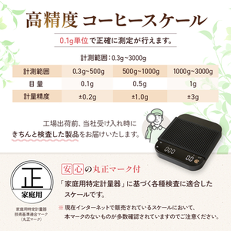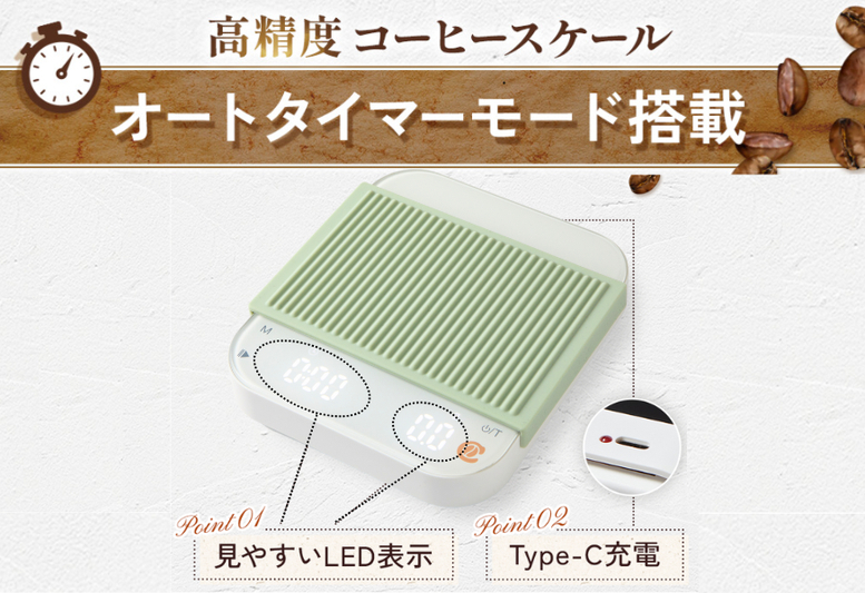 高精度のコーヒースケールは0.1g単位まで測定でき、コーヒー豆/粉の細かな分量も正確に測定できます。
