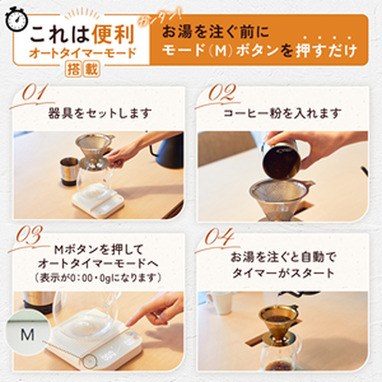 ハンドドリップを想定し、お湯を抽出すると自動でタイマーがスタートするオートタイマーモードを搭載。