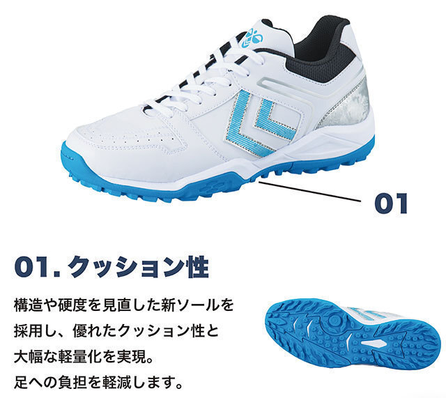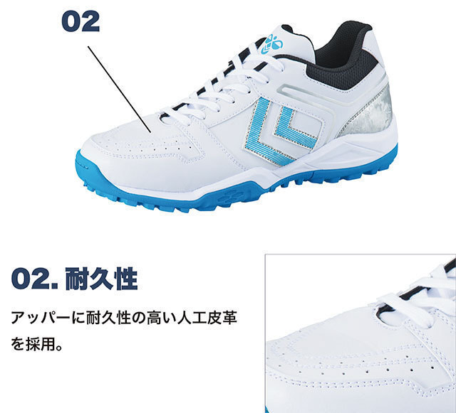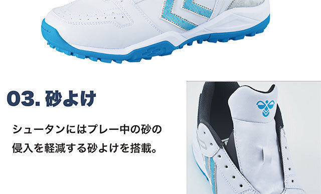 アッパーに人工皮革を使用した、耐久性のあるアウトコート用ハンドボールシューズ。砂除けがついているので、快適な履き心地をキープ。取り外し可能なカップインソールで、お手入れも簡単。