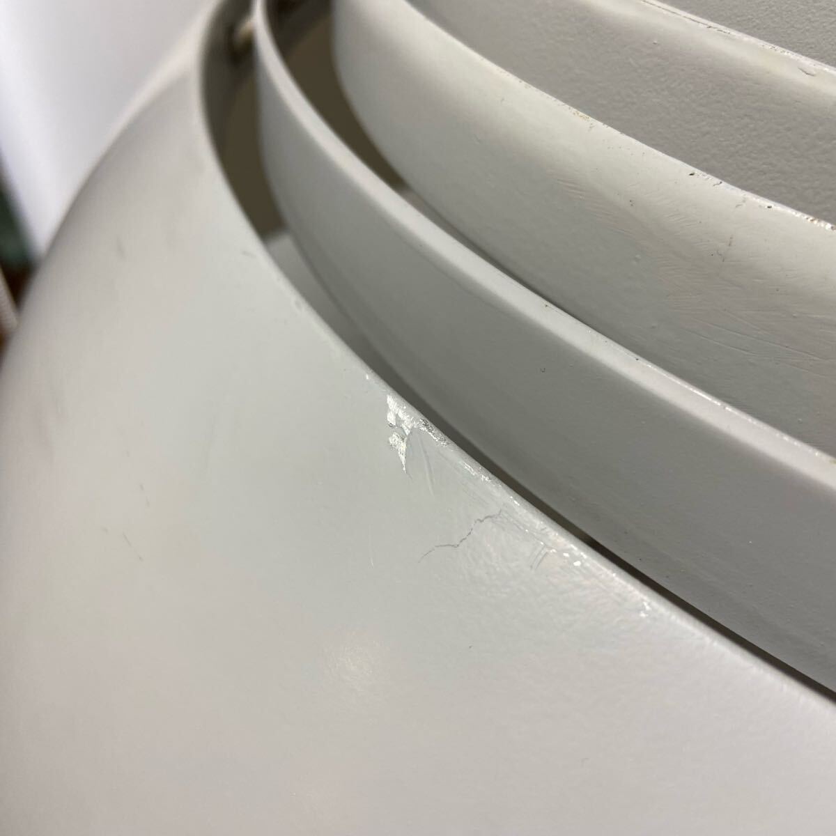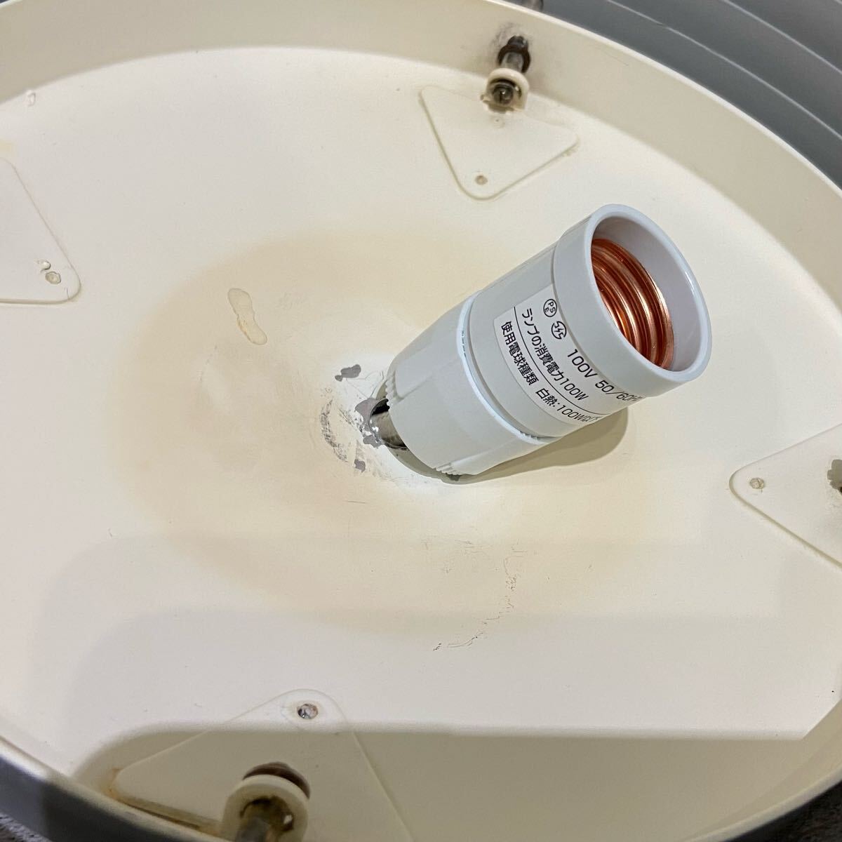 シェードは古い物になります。ところどころキズや打痕、内側の変色、落ち切らない汚れなど多数見られます。灯具は新品に交換してありますので、使用には問題ありません。