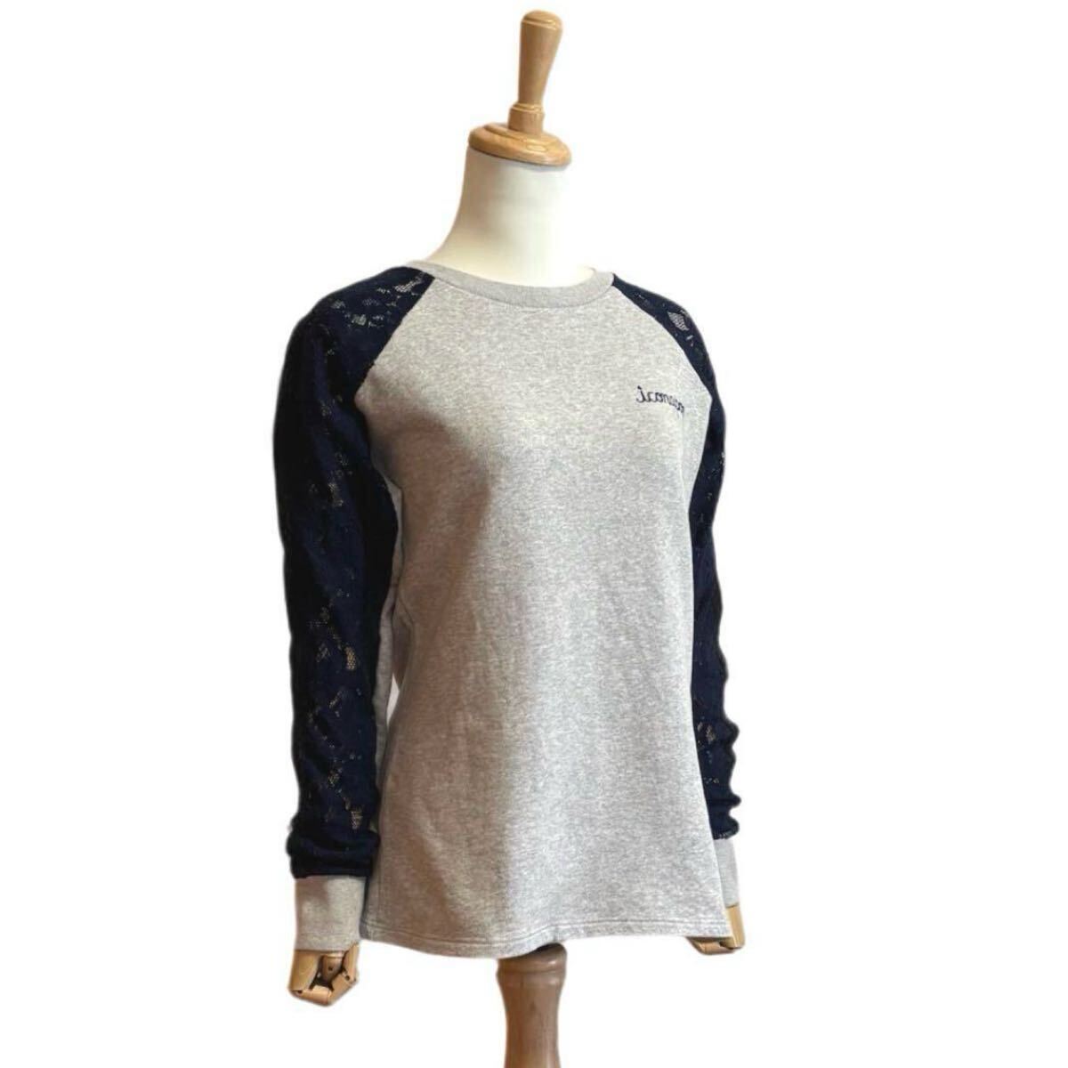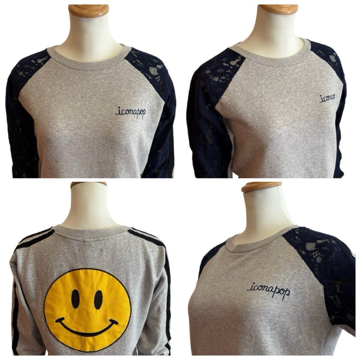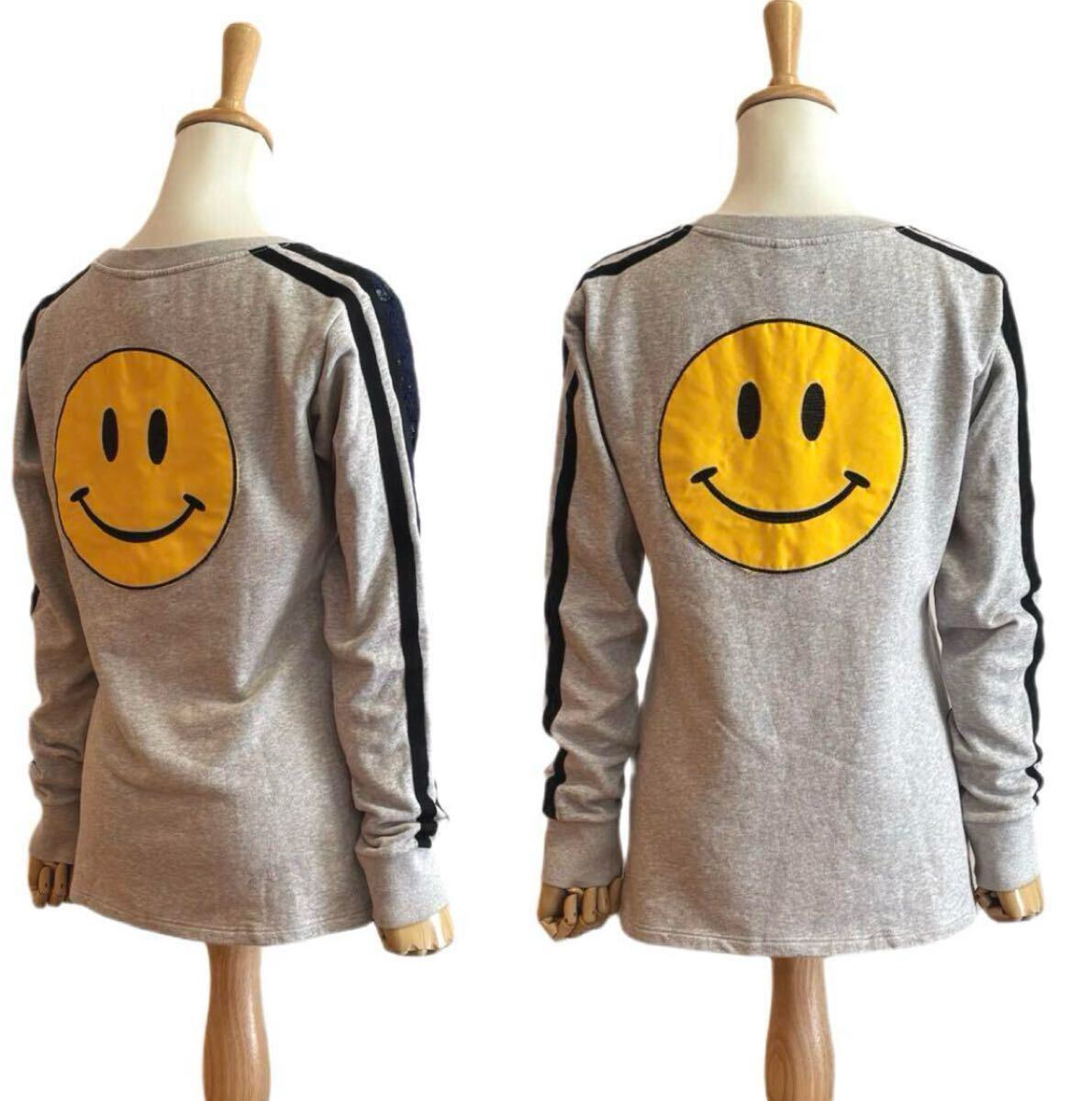 遊び心あふれるデザインが魅力のリメイク風プルオーバースウェットです。背中に大きなスマイルワッペン、袖部分に施されたレースがフェミニンな要素をプラスし、カジュアルながらもエレガントな印象です。
