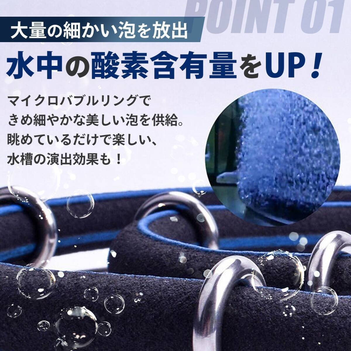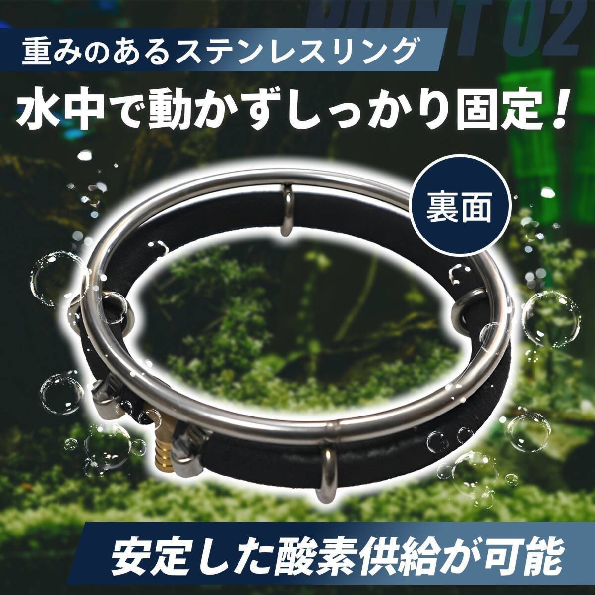 このエアーリングは、観賞魚や水草がいるアクアリウムに最適な水槽アクセサリーです。円形のステンレス製リングとエアーストーンが組み合わさり、静音で酸素を供給します。微細なマイクロバブルを発生させることで、錦鯉や金魚、メダカなどの魚たちに必要な酸素を提供します。エアーポンプリングとして、水槽内の美しい泡を楽しみながら、魚たちの健康を守ります。