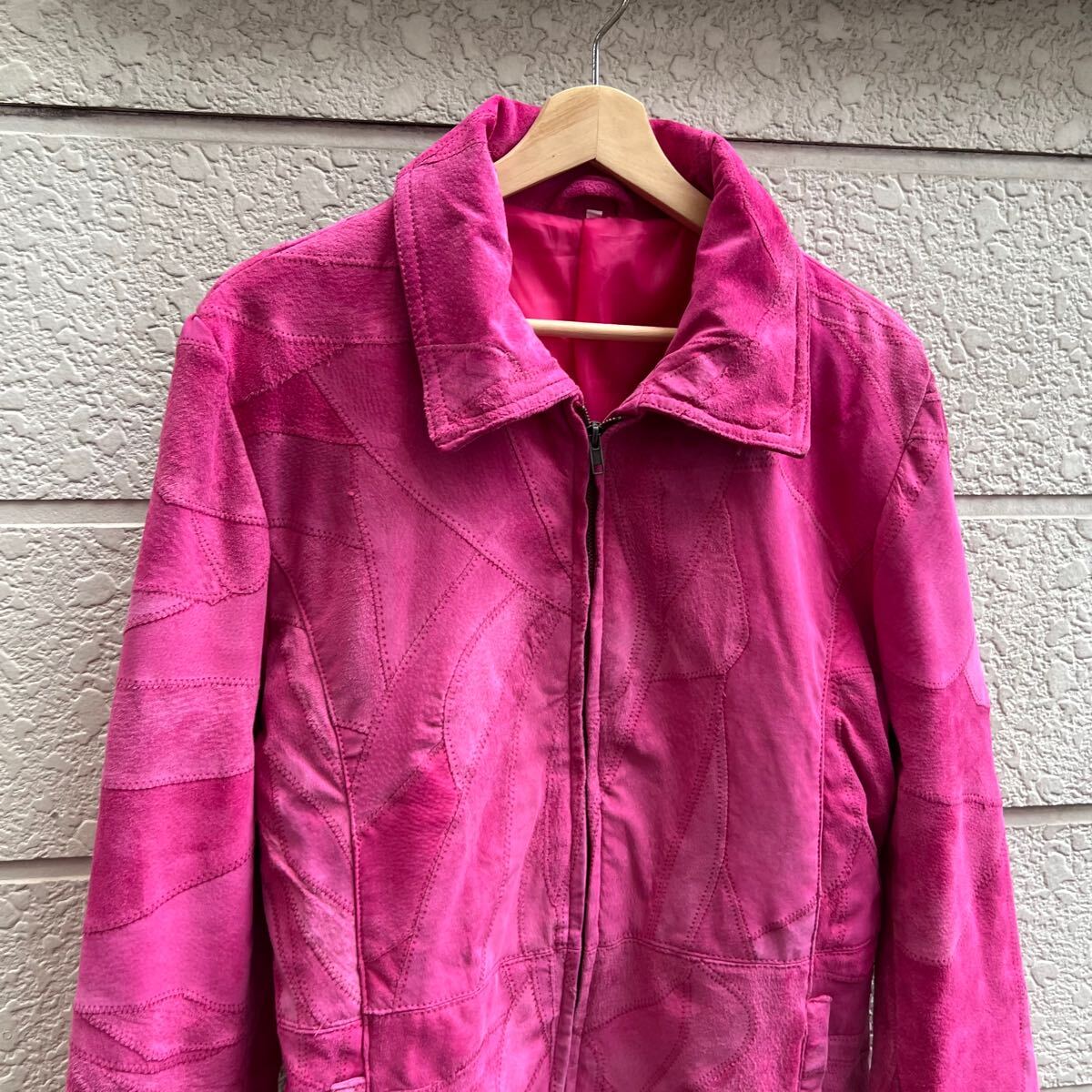 鮮やかなピンクカラーのレザーでパッチワークが素敵な一着。