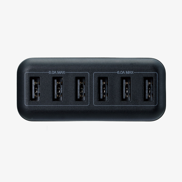 | ●6つのUSBポートを搭載し、スマートフォンやタブレットのほか さまざまなUSB機器をこれ一つで急速充電できるAC充電器 | |