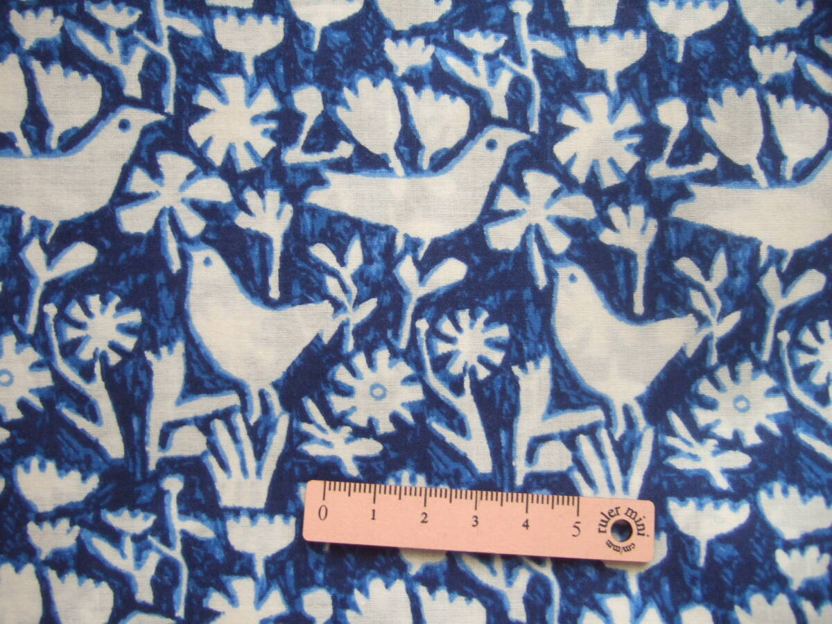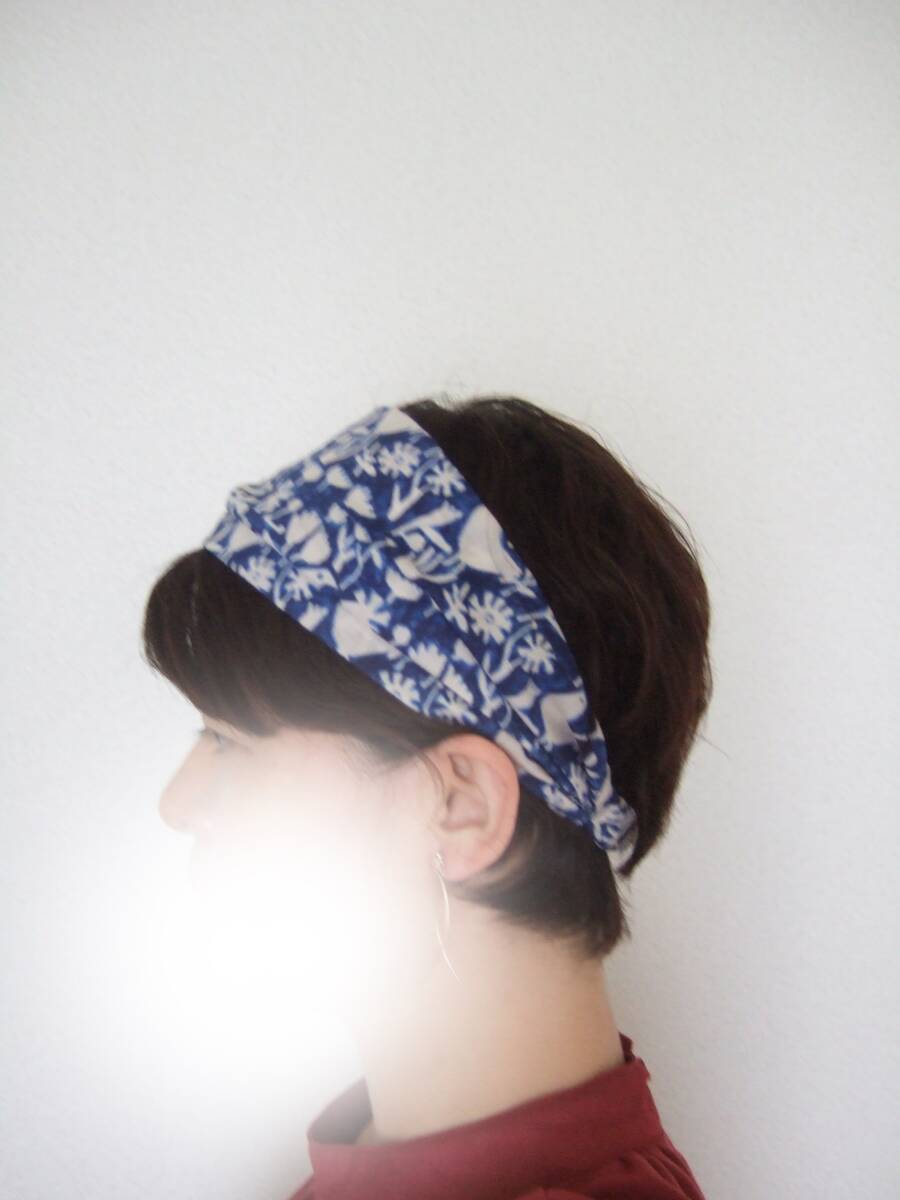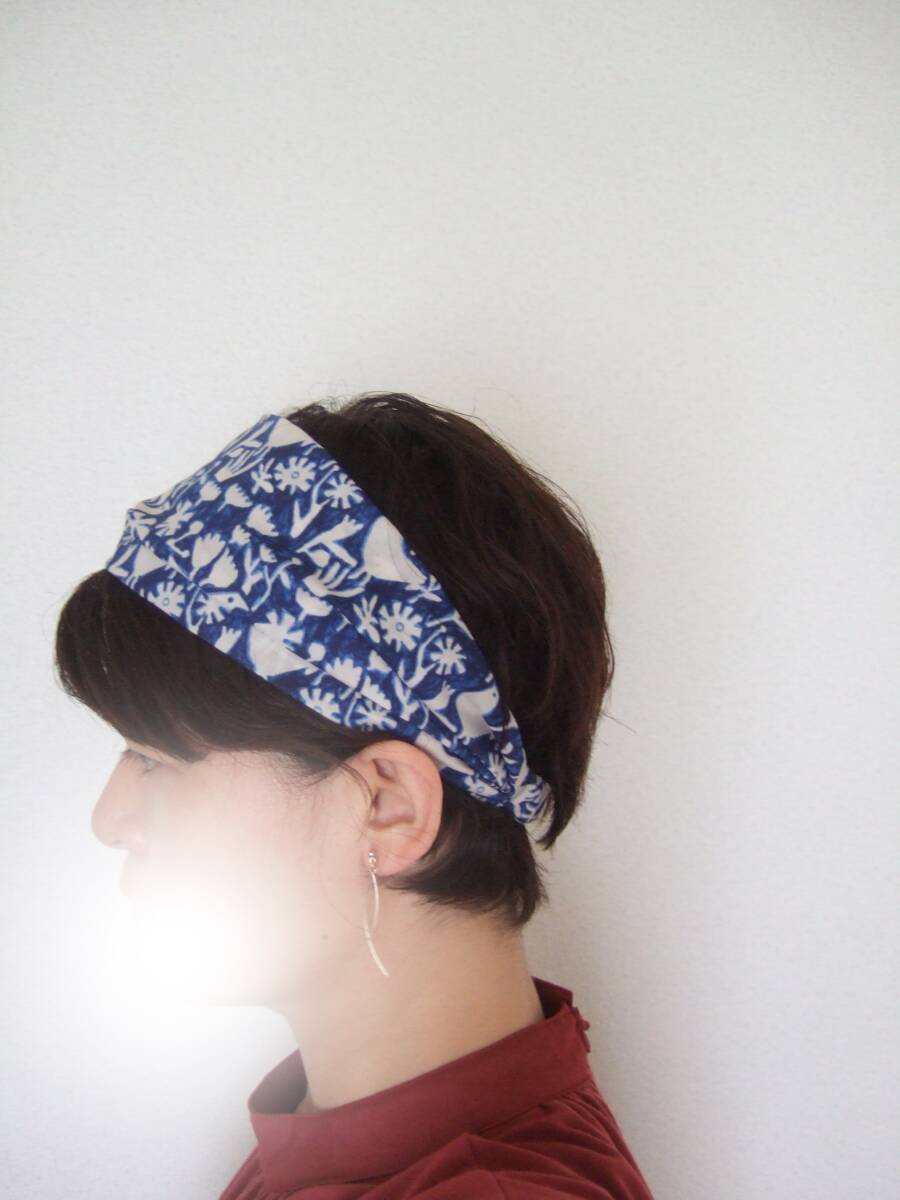 ★即決★ハンドメイド ブルーがきれいな水彩風鳥 綿ローン薄手コットンのゆるターバン**ヘアバンド 花粉症の髪よけにも