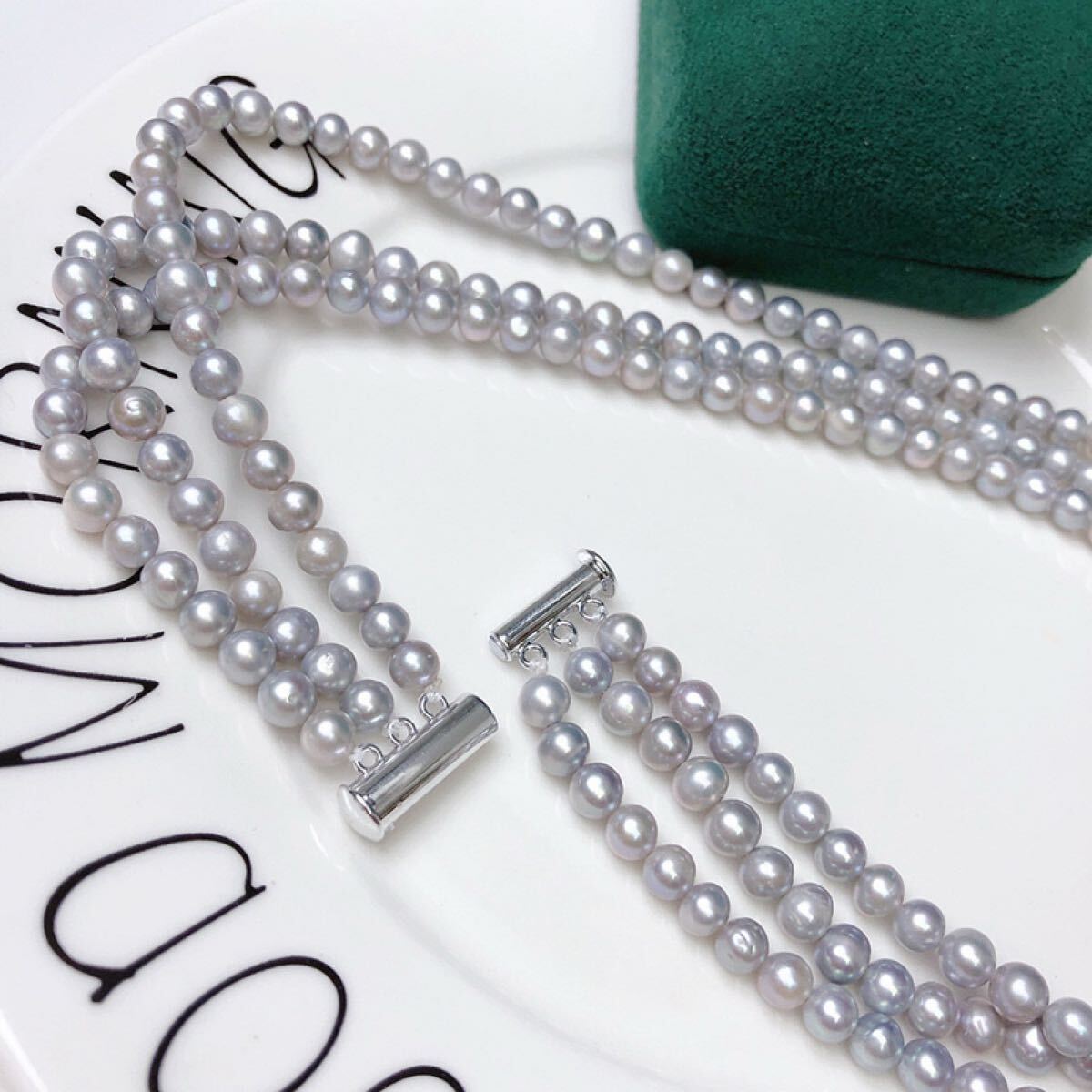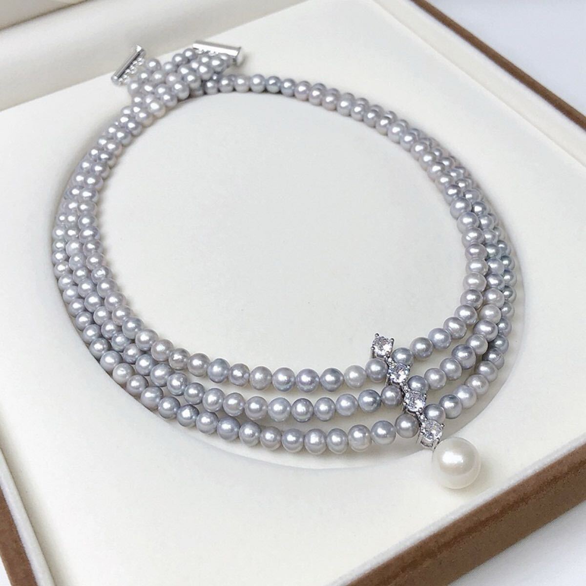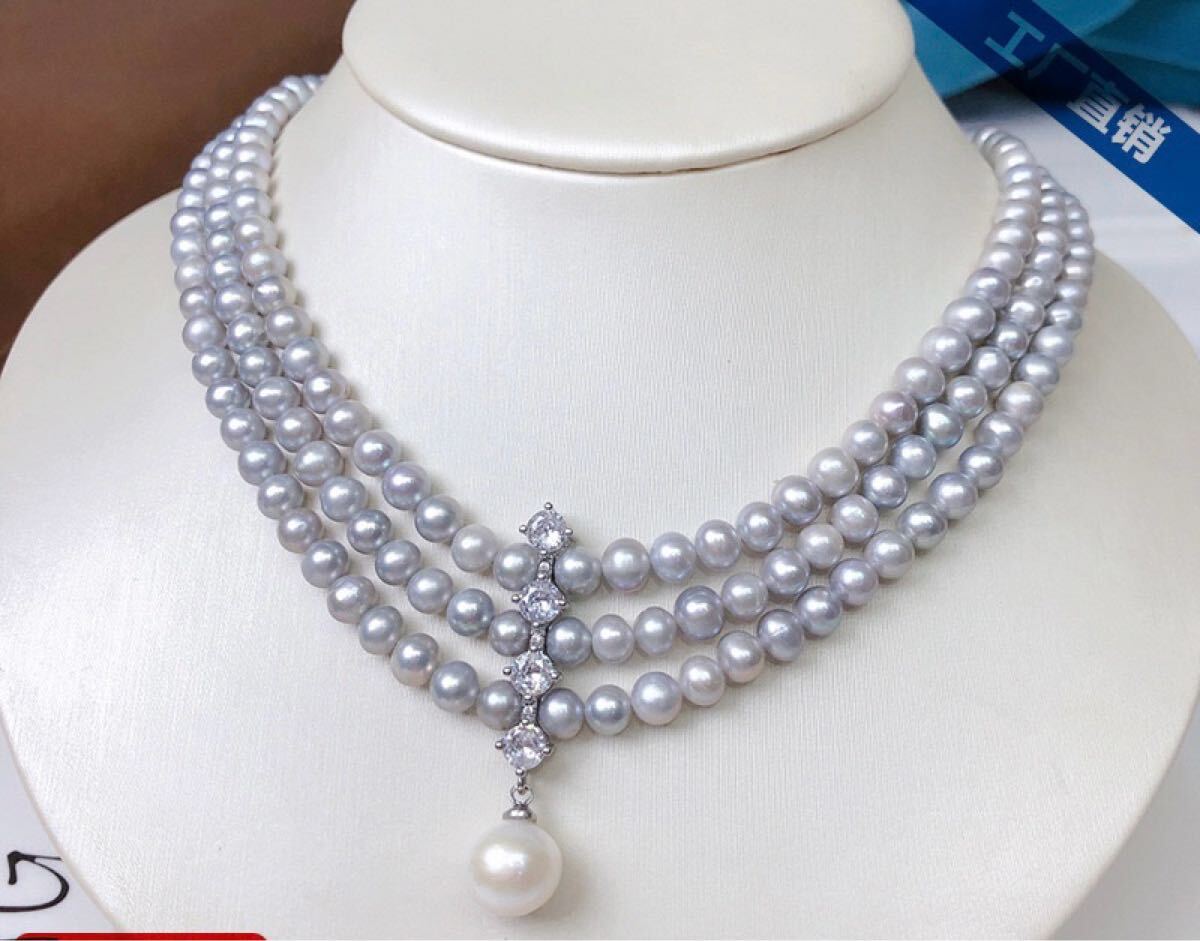 本真珠ネックレス 3連大玉淡水パールジルコニア優雅グレー