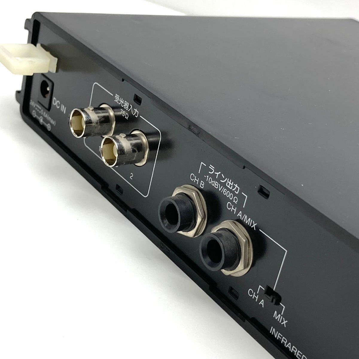 サイズ・仕様 | 2チャンネル受信できる、周波数固定式の据え置き型赤外線チューナーです。 電源:AC100 V 50/60 Hz(ACアダプター(付属)より供給) 消費電力:15 W以下 受信周波数: チャンネルA:3.100 MHz チャンネルB:3.350 MHz トーンスケルチ周波数:32.768 kHz 受光器入力:75 Ω BNCジャック×2 (赤外線受光器供給電源 DC24 V 2端子合計最大220 mA) 出力:チャンネルAB:-10 dB*(±4.8 kHz偏移音量調節器最大) 600 Ω 電子バランス 3極ホーンジャック (チャンネルAはミキシング出力に切換可) 周波数特性:100 Hz~12 kHz 使用温度範囲:-10 ℃~+50 ℃ 使用湿度範囲:30 %~85 %RH 仕上 ケース:ABS樹脂 黒(マンセルN1.0近似色) 寸法:210(W)×44(H)×210.9(D) mm 質量:630 g(本体のみ) |