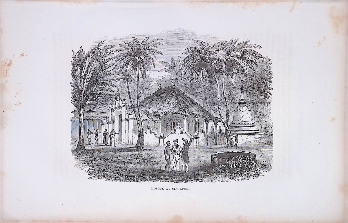 ペリー提督が1852年から1854年にかけて日本を訪問した記録である1855年にAppleton 社から刊行されたペリー提督日本遠征記の添付木版画です。日本遠征途上に訪れた国の風景や風俗を同行したドイツ人画家ハイネが描いています。当時の貴重な歴史史料です。サイズは、16cmx25cmで、裏は白紙です。シミや古色がありますが、良く保存されています。