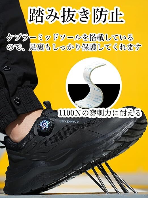 ダイヤル式 安全靴 作業靴 あんぜん靴 軽量 通気性 黒 釘踏み抜き防止 耐摩耗 厚底 防滑 衝撃吸収 サイズ:27.5cm