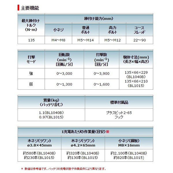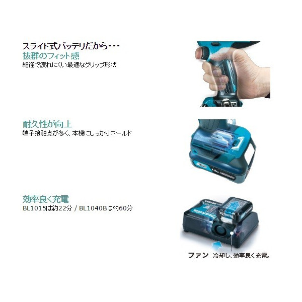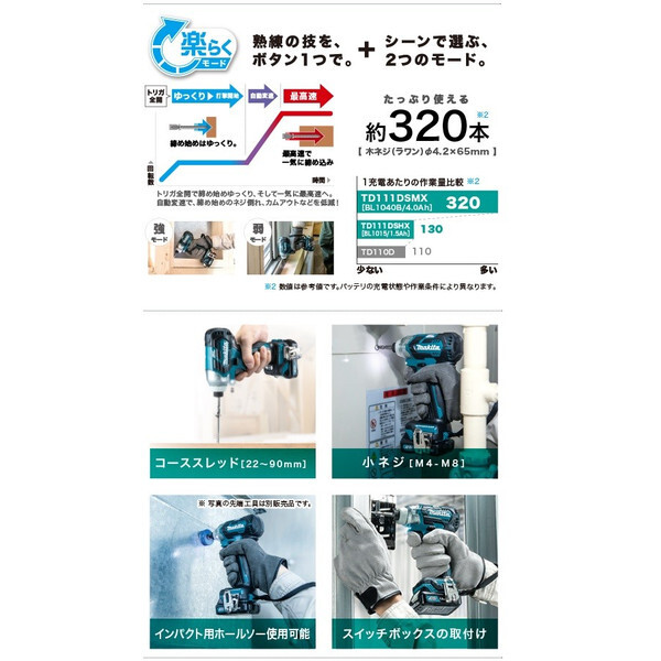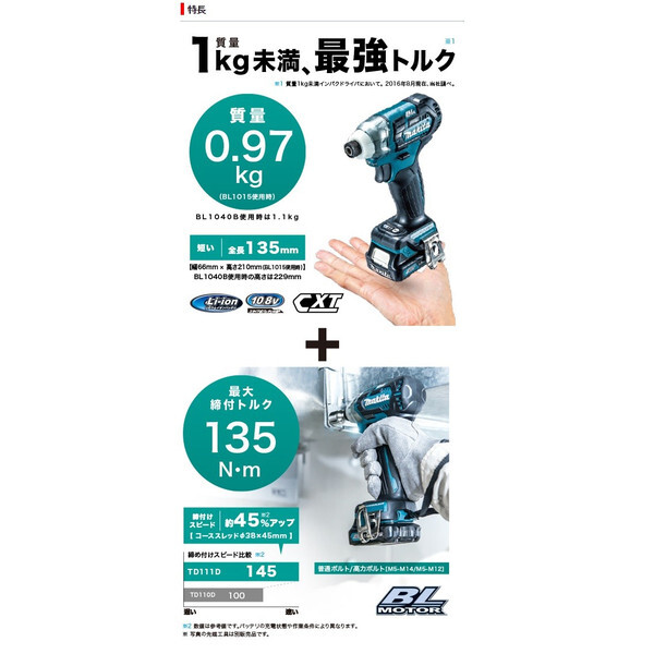 マキタ makita充電式インパクトドライバTD111DZB ブラック※バッテリー・充電器・ケースは別販売品です。88381830003質量1kg未満、最強トルク!※質量1kg未満インパクドライバにおいて。 2016年8月現在、マキタ社調べ。 ■最大締付トルク135N・m ■熟練の技をボタン1つで+シーンで選ぶ、2つのモード トリガ全開で締め始めゆっくり、そして一気に最高速へ。 自動変速で、締め始めのネジ倒れ、カムアウトなどを低減!■コーヅヅレッド(22~90mm)■小ネジ(M4~M8)■インパクト用ホールソー使用可能■スイッチボックスの取付け■スライド式バッテリだから、抜群のフィット感 細径で疲れにくい最適なグリップ形状■耐久性が向上 端子接触点が多く、本機にしっかりホールド