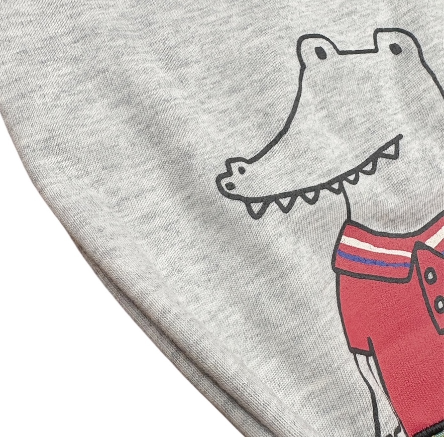 ワニのパンツ部分はサッカーチェックのアップリケ使い&背面にはmoujonjonロゴプリント入り。