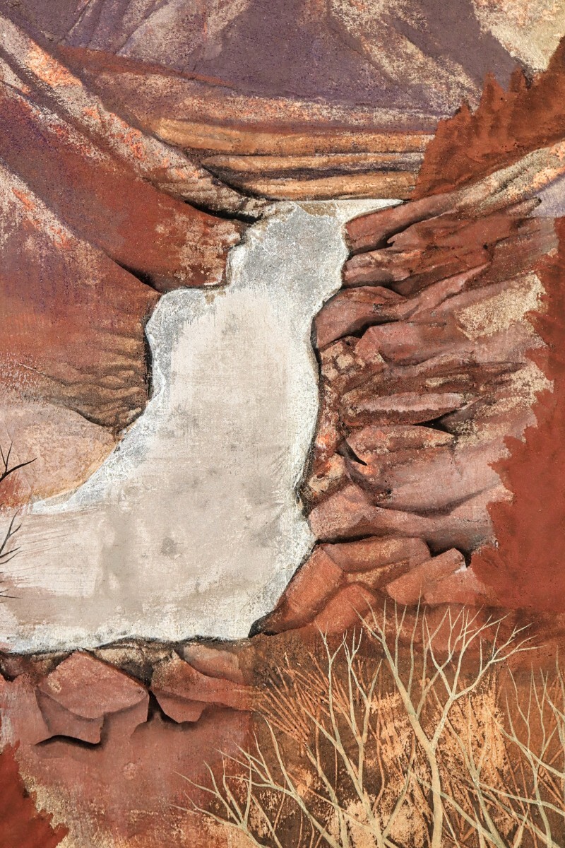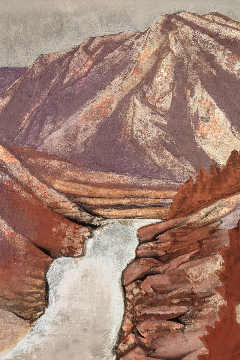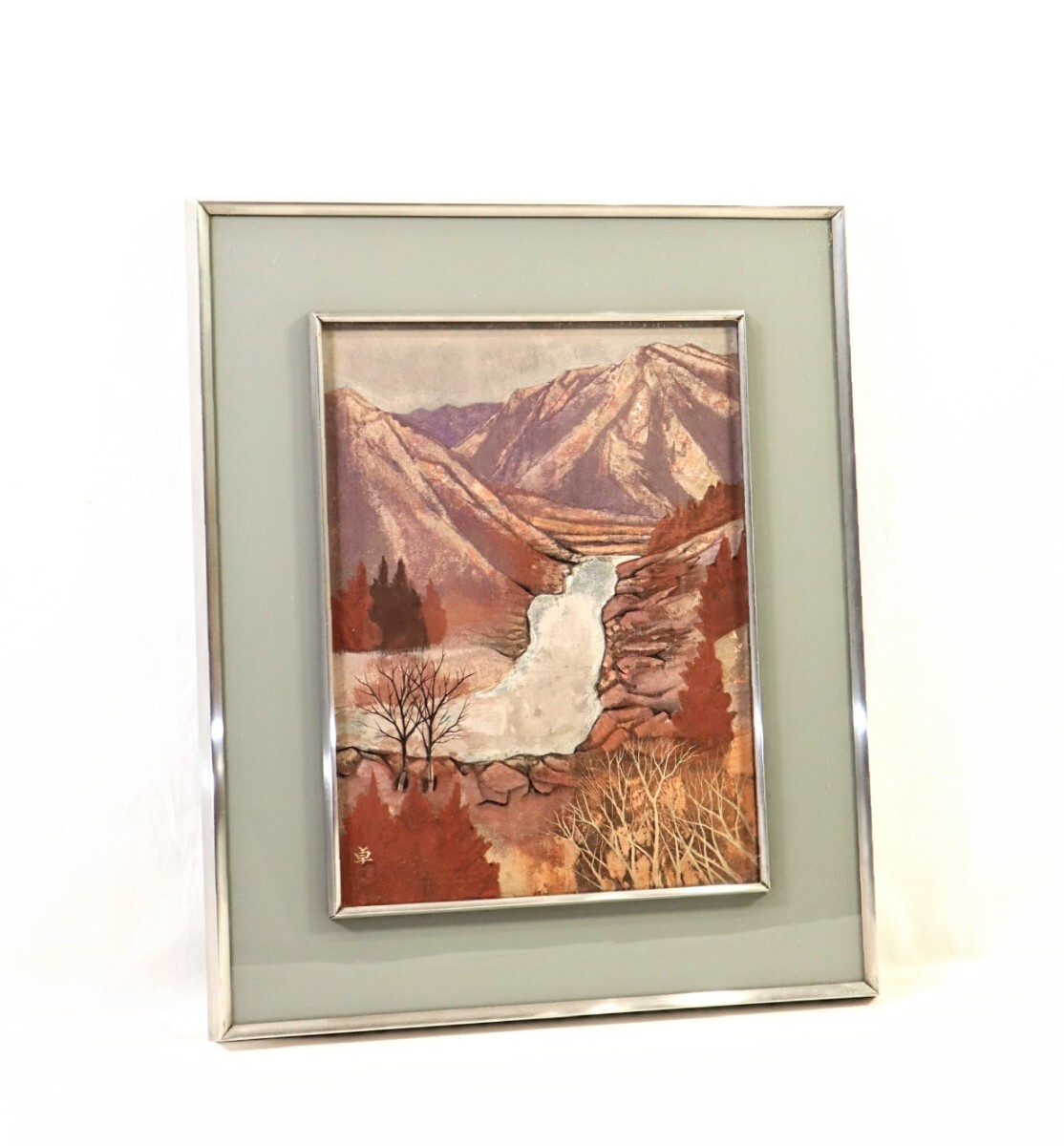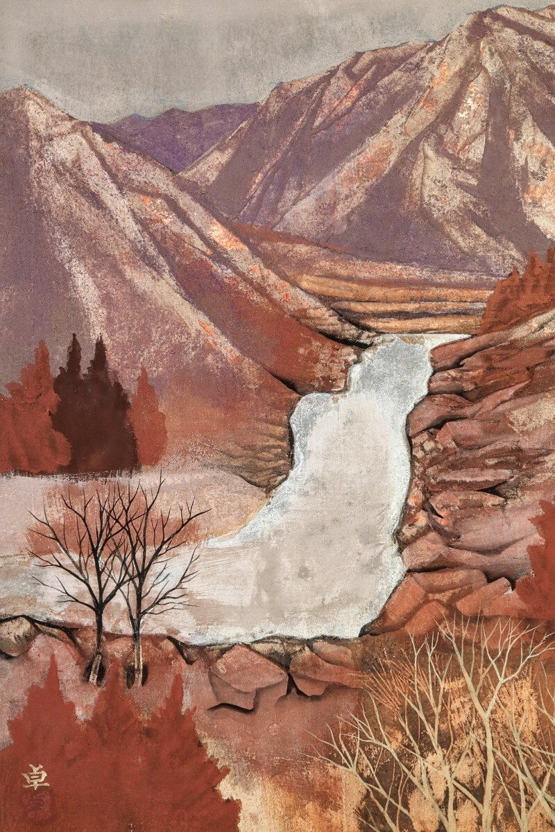 真作 上原卓 日本画「香落渓」画寸 27×36cm 京都府出身 創画会会員 京都市立芸大教授 身辺な自然を写実的に描写 三重県名張市の渓谷 10290