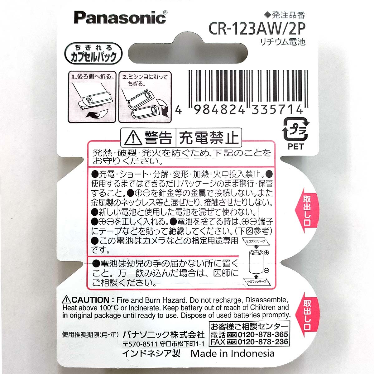 | リチウム電池 CR123A【2個入】 ・「数量1」の入札(落札)で、2個入です。 ・「数量2」の入札(落札)なら、4個になります。 未使用、未開封の新品で、 使用推奨期限が2031-7(以降) のものをお送りします。 ・パナソニック / Panasonic ・型番: CR-123AW/2P ・公称電圧: 3V ・円筒形電池 ・インドネシア製 ・JAN 4984824335714 ・相当品: K123LA, EL123AP, DL123A, CR123R ×充電式ではありません パッケージのデザインは、多少異なる場合があります。 ----------------------------------------- ■この商品は下記の配送方法に対応します。 複数落札や他商品と同梱の際は、その都度お見積もりします。 ※リチウム電池は空輸できないため、沖縄県や離島をはじめ、 遠方宛は通常以上の配達日数を要する場合があります。 ●ヤマト運輸 宅急便 元払 (この送料で「数量40」まで同梱可) ・北海道:1,400円 ・青森/岩手/秋田県:1,020円 ・宮城/山形県/~この間の地域すべて~/三重/岐阜/福井県:900円 ・滋賀/京都府/大阪府/兵庫/奈良/和歌山県:1,020円 ・岡山/鳥取/広島/島根/山口/四国各県:1,150円 ・九州各県:1,400円 ・沖縄県:1,460円 ○宅急便の配達日時の指定は、希望通りにならない可能性をご了承の上でお受けします。 ただし天候や交通事情等により、100%の確約はできません。 指定できる時間帯 (指定なし, 8-12, 14-16, 16-18, 18-20, 19-21時) ・お届けの際に受領印が必要です (宅配BOX等があれば、この限りではありません) ●ヤマト運輸 宅急便コンパクト(専用BOX代込) 元払 (この送料で「数量30」まで同梱可) ・北海道:940円 ・青森/岩手/秋田県:780円 ・宮城/山形県/~この間の地域すべて~/三重/岐阜/福井県:700円 ・滋賀/京都府/大阪府/兵庫/奈良/和歌山県:780円 ・岡山/鳥取/広島/島根/山口/四国各県:830円 ・九州各県:940円 ・沖縄県:940円 ○宅急便コンパクトの配達日時の指定は、希望通りにならない可能性をご了承の上でお受けします。 ただし天候や交通事情等により、100%の確約はできません。 指定できる時間帯 (指定なし, 8-12, 14-16, 16-18, 18-20, 19-21時) ・お届けの際に受領印が必要です (宅配BOX等があれば、この限りではありません) ●佐川急便 飛脚宅配便 元払 (この送料で「数量40」まで同梱可) ・北海道:1,000円 ・青森/岩手/秋田:760円 ・宮城/山形/~この間の地域すべて~/三重/岐阜/福井:690円 ・京都/滋賀/奈良/和歌山/大阪/兵庫:760円 ・岡山/広島/山口/鳥取/島根:820円 ・四国各県:940円 ・九州各県:1,000円 ・沖縄県:1,914円 ・離島は中継料金が別途加算される場合があります。 ・お届けの際に受領印が必要です (宅配BOX等があれば、この限りではありません) -------------------------- ■以下の配送方法は 簡易梱包 になります。 厚さや重さ、荷姿に制約があるため、緩衝材をほとんど使えず、商品を茶封筒等に単に封入するだけになります。 潰れや角折れ等の傷みが発生する可能性が高くなりますので、あらかじめご了承ください。 未着・紛失や破損、また初期不良があっても返品・返金・修理・交換等の対応外とします。 -------------------------- ●ヤマト運輸 ネコポス : 385円 (この送料で「数量20」まで同梱可) ・配達日時は指定できませんが、東北~関西宛は出荷日の翌日配達が基本です。ただし天候や交通事情等により、100%の確約はできません ・受取人様宅の郵便受に配達(投函)されます。受領印は不要 ・紛失・破損等(初期不良が疑われる場合も含む)あっても補償はありません ●日本郵便 レターパック・プラス : 600円 (この送料で「数量32」まで同梱可) ・配達日時や配達期限は指定できません ・お届けの際に受領印が必要です (不在時に宅配BOXへ配達希望の場合は、宛名に「宅配BOX希望」と書き添えてください) ・紛失・破損等(初期不良が疑われる場合も含む)あっても補償はありません ●日本郵便 レターパック・ライト : 430円 (この送料で「数量20」まで同梱可) ・配達日時や配達期限は指定できません ・受取人様宅の郵便受に配達(投函)されます。受領印は不要 ・紛失・破損等(初期不良が疑われる場合も含む)あっても補償はありません ●日本郵便 クリックポスト : 185円 (この送料で「数量20」まで同梱可) ・配達日時や配達期限は指定できません ・受取人様宅の郵便受に配達(投函)されます。受領印は不要 ・紛失・破損等(初期不良が疑われる場合も含む)あっても補償はありません ●日本郵便 スマートレター : 210円 (この送料で「数量10」まで同梱可) ・配達日時や配達期限は指定できません ・配送日数 1週間~10日 ・受取人様宅の郵便受に配達(投函)されます。受領印は不要 ・紛失・破損等(初期不良が疑われる場合も含む)あっても補償はありません ●日本郵便 普通郵便 : 140円 (この送料で「数量1」まで) ◆「数量2」のときは180円 ・配達日時や配達期限は指定できません ・配送日数 1週間~10日 ・受取人様宅の郵便受に配達(投函)されます。受領印は不要 ・紛失・破損等(初期不良が疑われる場合も含む)あっても補償はありません ●ゆうパケットポスト(匿名配送) : 230円 (この送料で「数量20」まで同梱可) ・配達日時