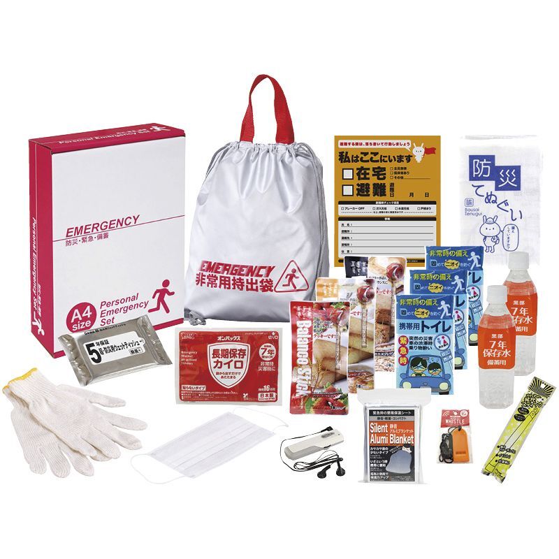 【セット内容】バランススティック・携帯用トイレ×各3、7年保存水(500ml)×2、非常用持出袋(34×39cm)・緊急避難カード・ウェットティッシュ・静音アルミブランケット・カイロ・防災てぬぐい・軍手・マスク・FMラジオ・ホイッスル・発光スティック×各1、FMラジオ:単4乾電池2本使用(別売)