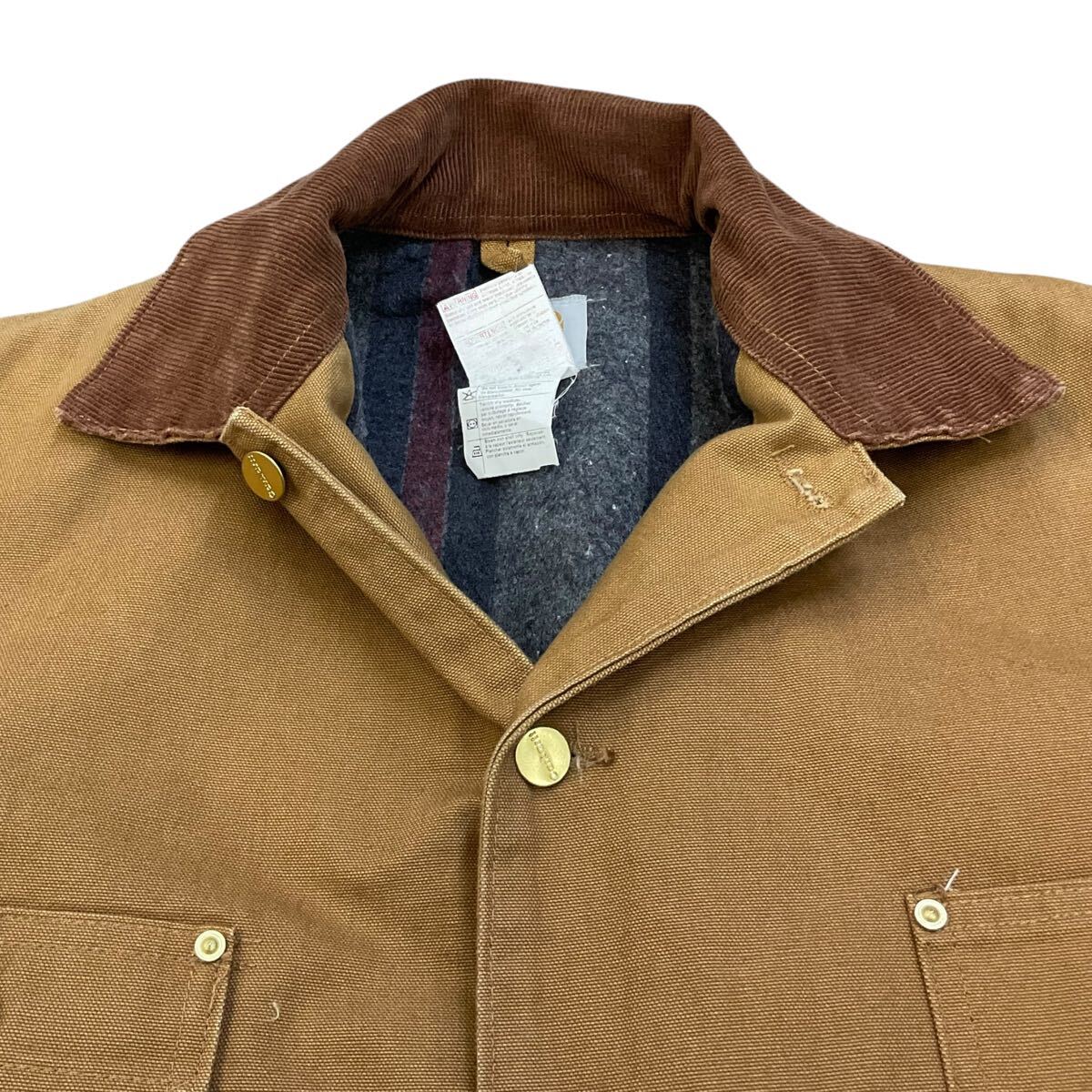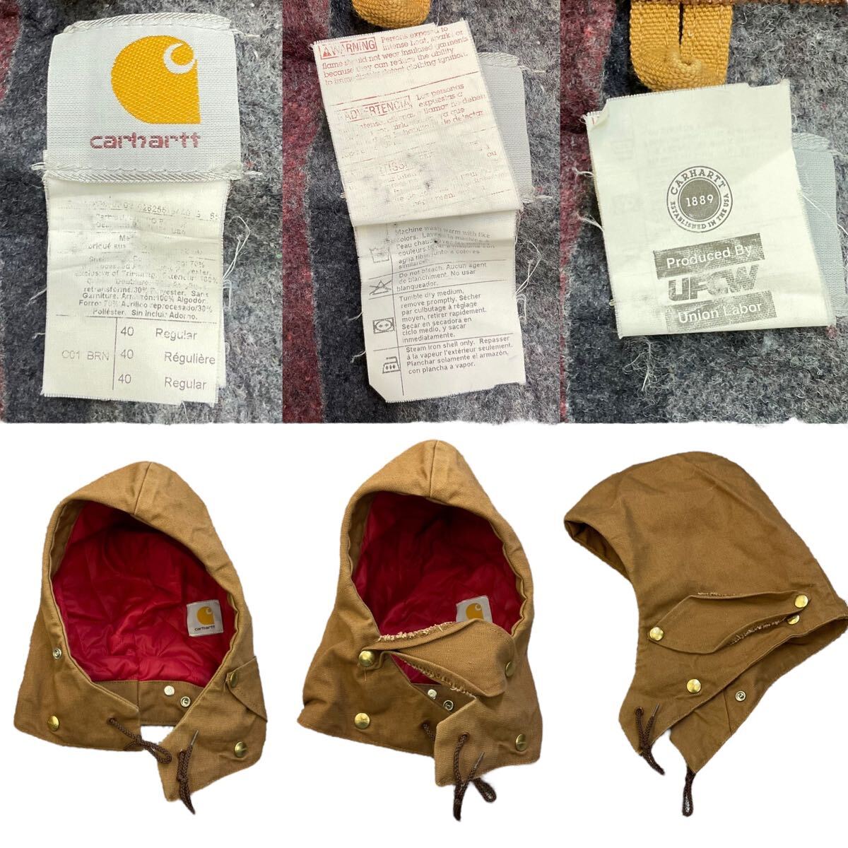 90s USA製 Carhartt チョアコート 40 ブラウン ダック地 フード付き ワンポイント ロゴ カバーオール ワーク カーハート ヴィンテージ