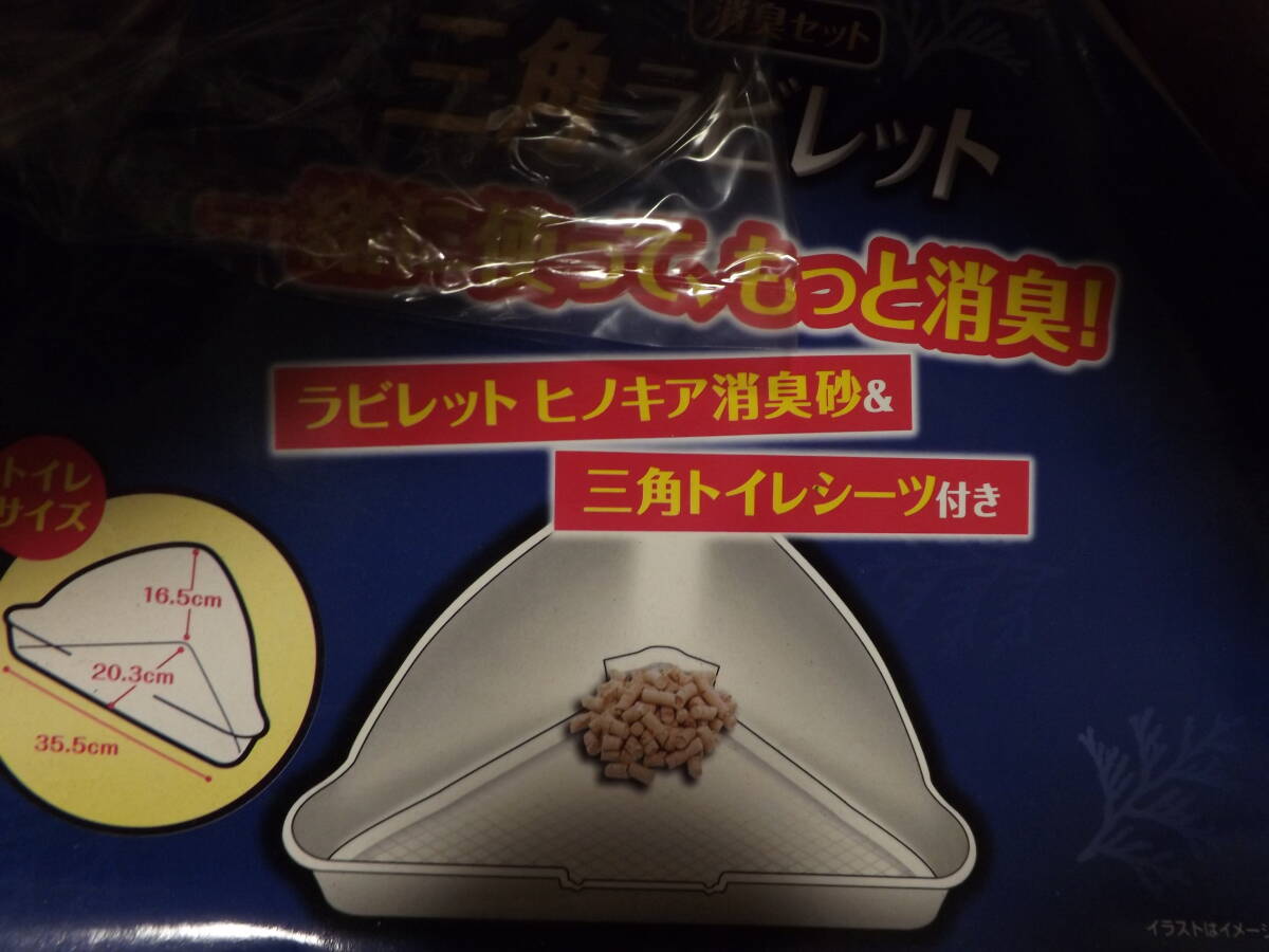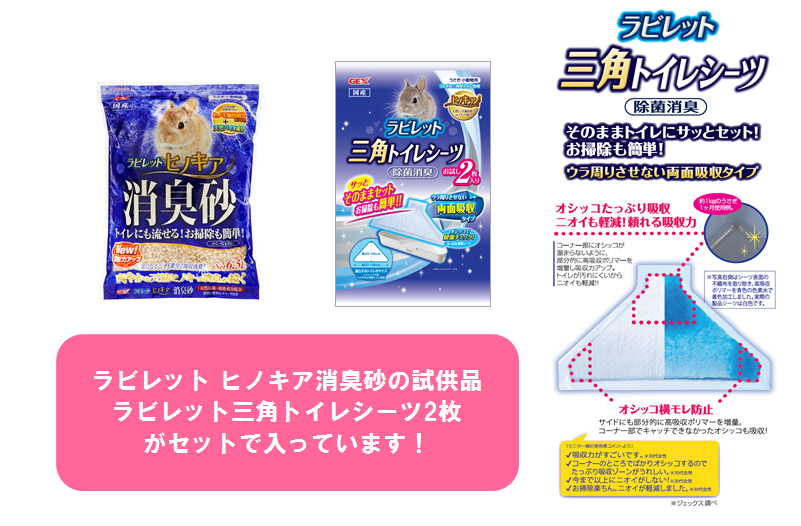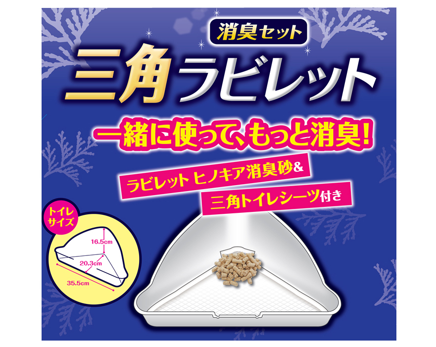 「ラビレット 三角トイレシーツ2枚」と新しくなった「ラビレット ヒノキア消臭砂」が付いた消臭セット!