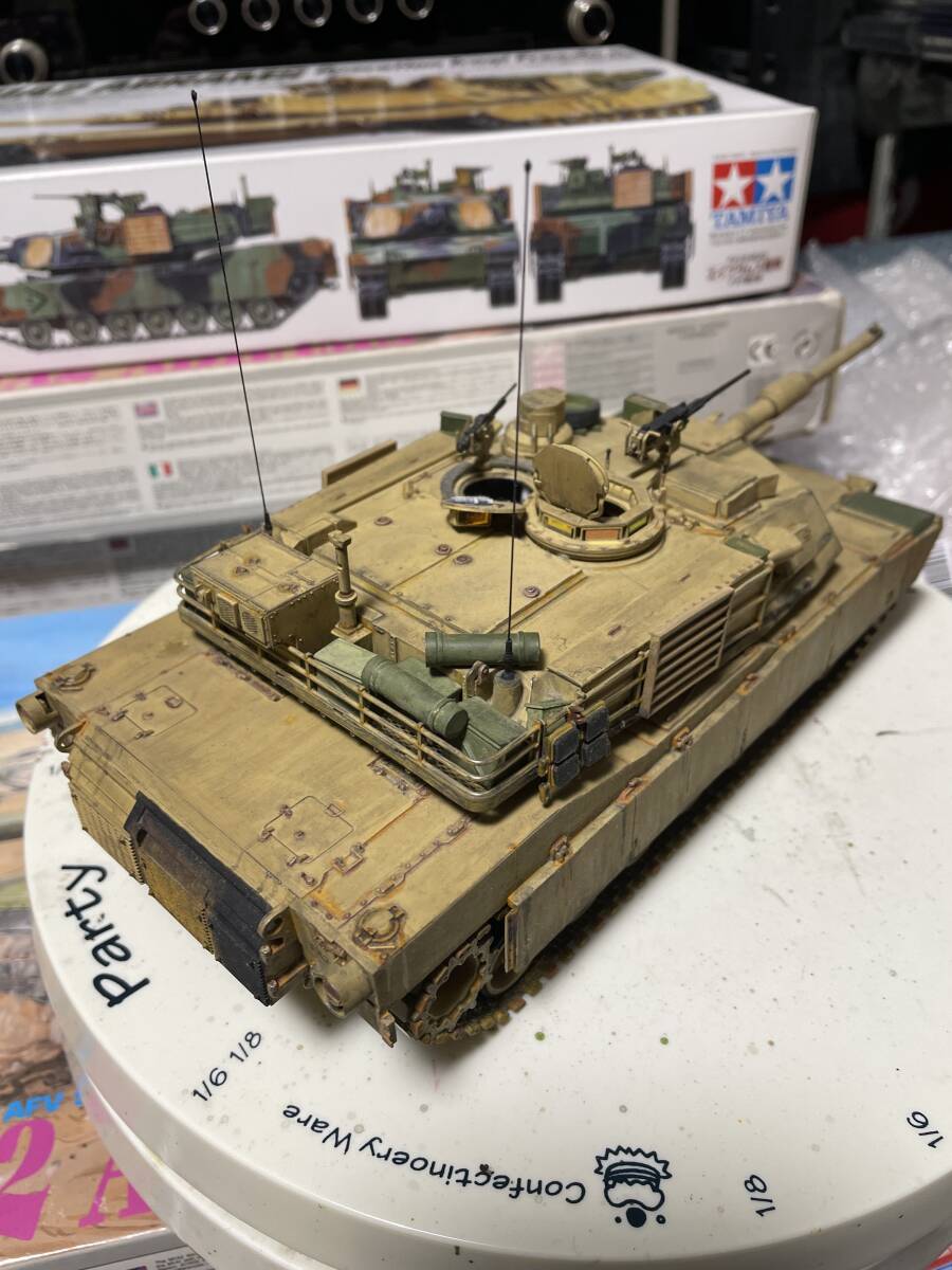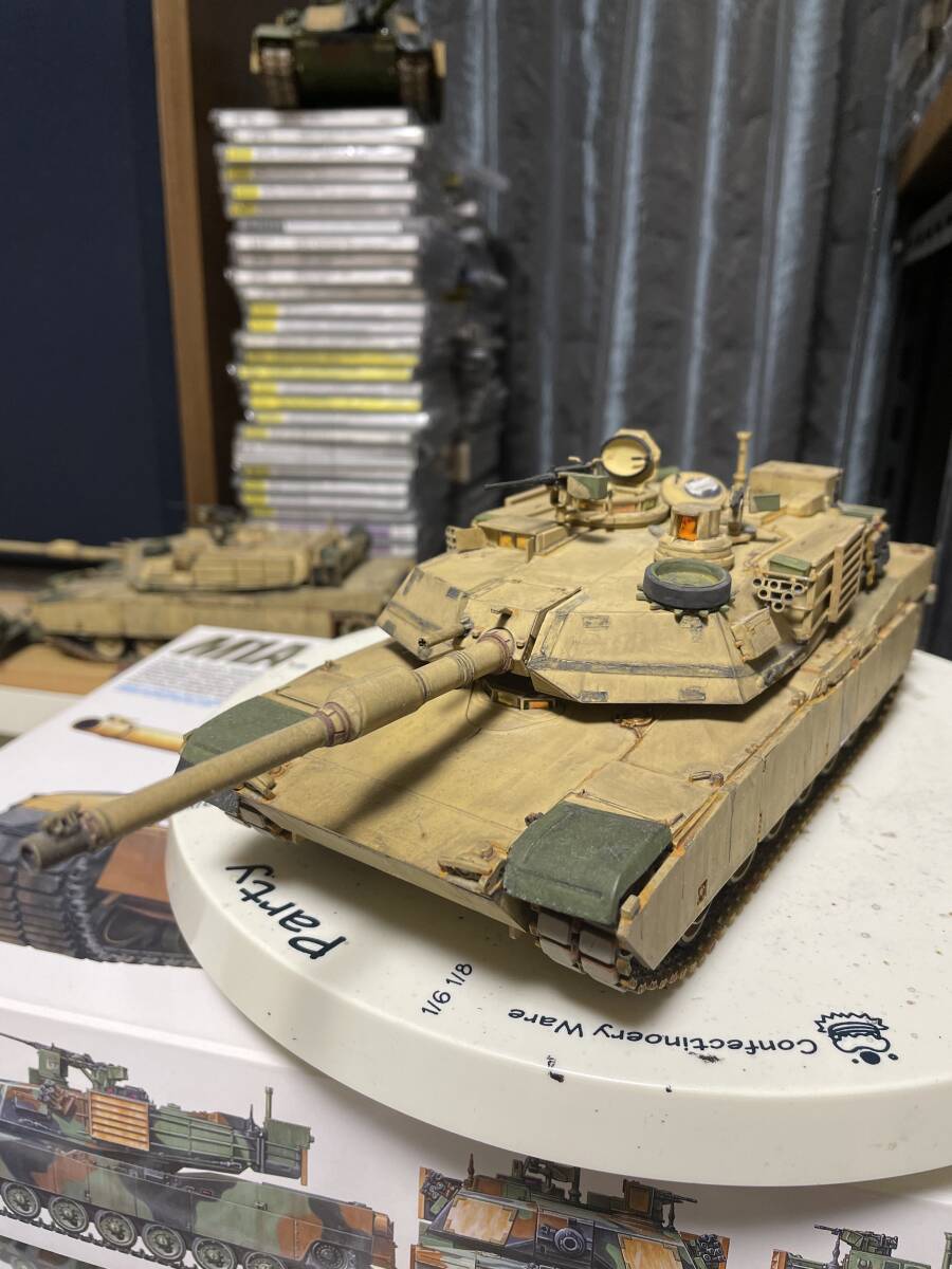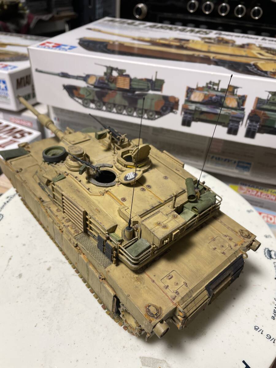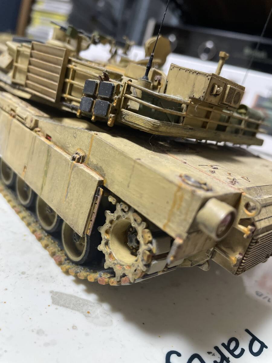 使用状況:M1A2エイブラムズ戦車塗装済完成車です。写真集から収集した情報を元に、フロントフェンダーのダメージ、失われた後部サイドフェンダー、砲塔前面から側面下部への識別テープ追加等イラク戦において使い込まれた車両をイメージし強めのウェザリングを施しました。塗料は基本色をエナメル、仕上げにアクリル塗料を使用し手塗りで丁寧に仕上げました。アンテナはキットのアンテナ基部を加工し0.3ミリ真鍮線を使用して作製。履帯はAFVクラブ製連結可動式を使用しておりますが強度確保のため車体に装着後固定しております。