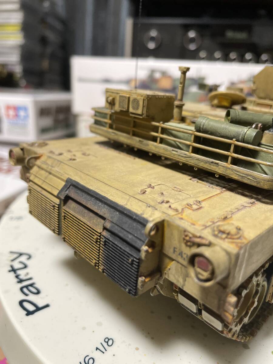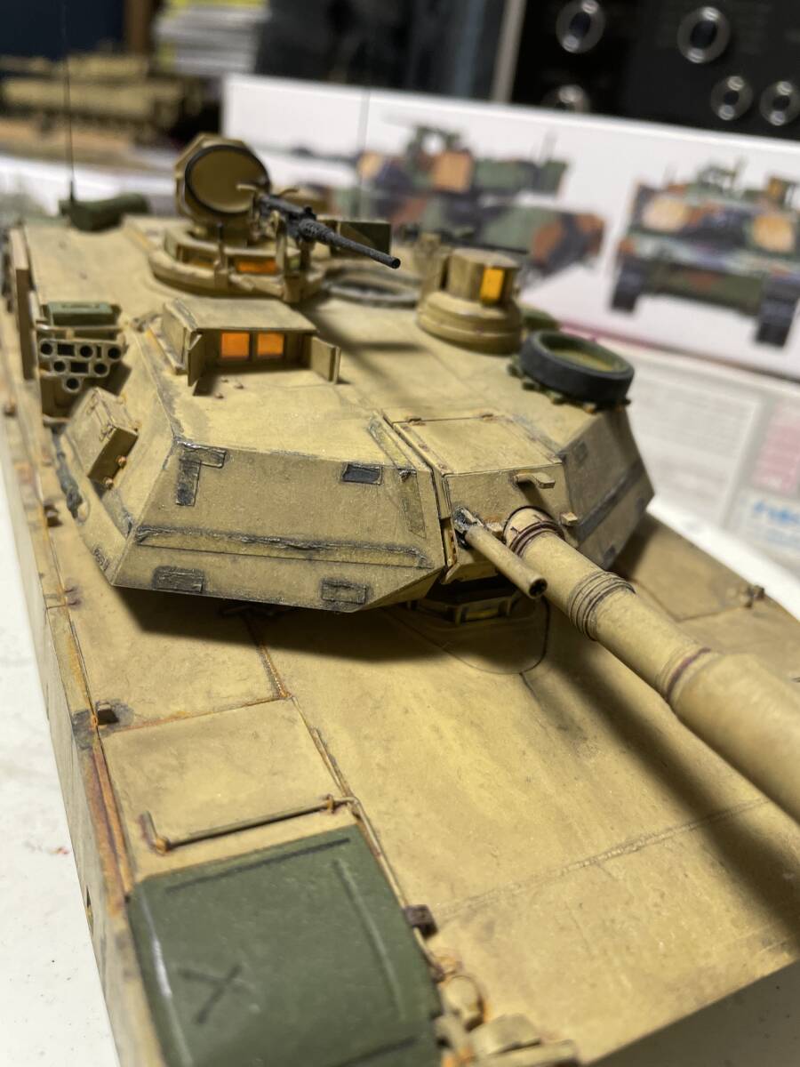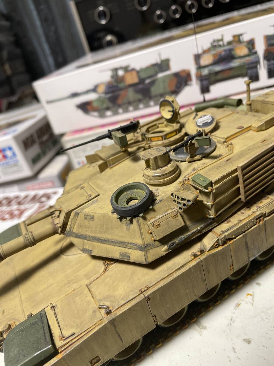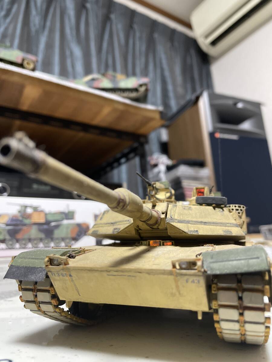 使用状況:M1A2エイブラムズ戦車塗装済完成車です。写真集から収集した情報を元に、フロントフェンダーのダメージ、失われた後部サイドフェンダー、砲塔前面から側面下部への識別テープ追加等イラク戦において使い込まれた車両をイメージし強めのウェザリングを施しました。塗料は基本色をエナメル、仕上げにアクリル塗料を使用し手塗りで丁寧に仕上げました。アンテナはキットのアンテナ基部を加工し0.3ミリ真鍮線を使用して作製。履帯はAFVクラブ製連結可動式を使用しておりますが強度確保のため車体に装着後固定しております。