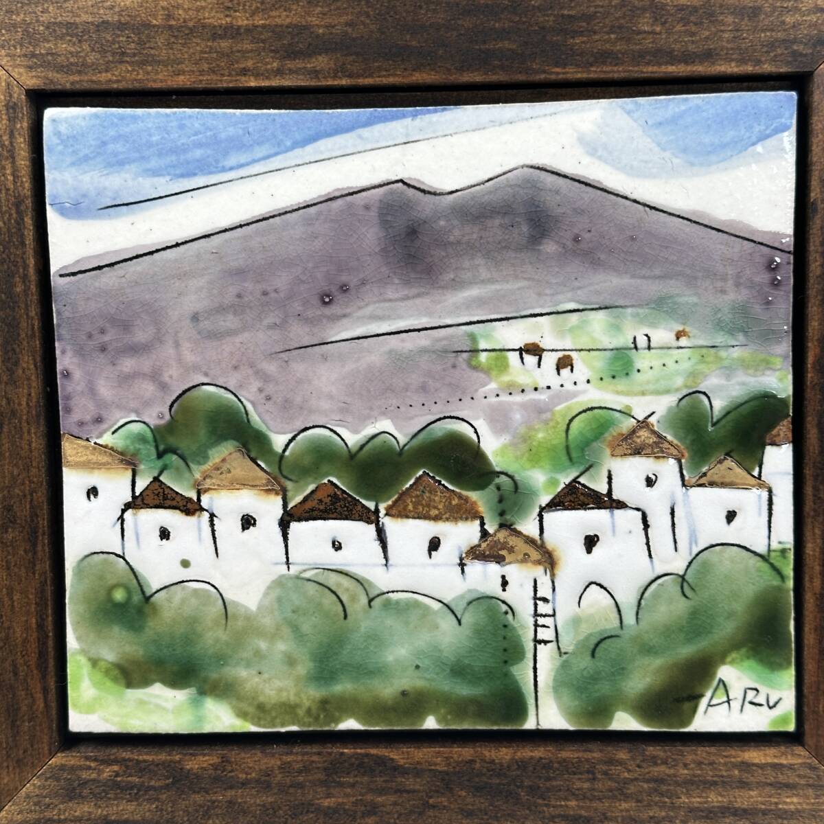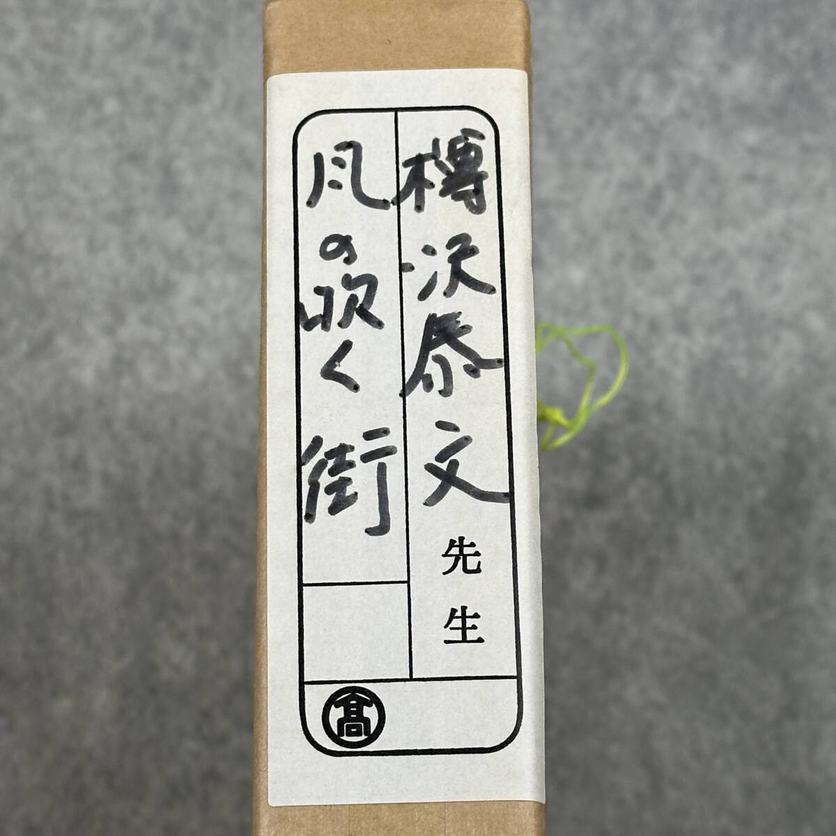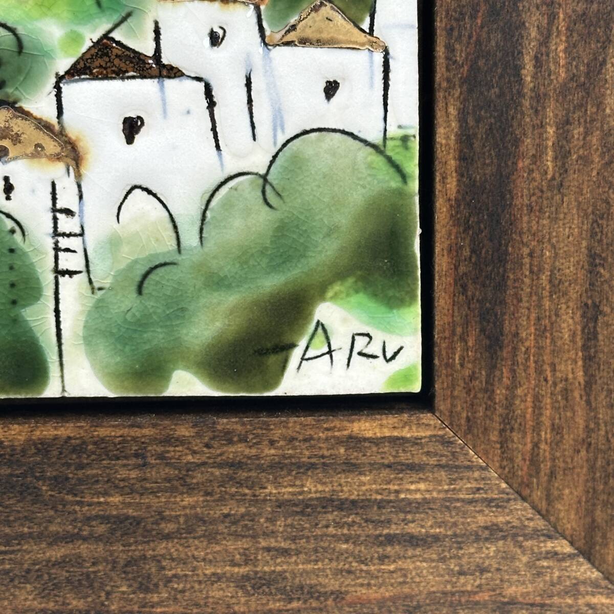 商品名:【真作】樽沢泰文 「風の吹く街」陶板 陶額 額寸 22cmx20.2cm 風景画 共箱 共シール