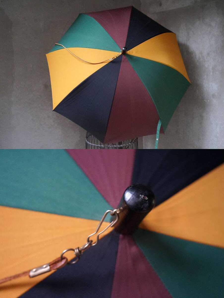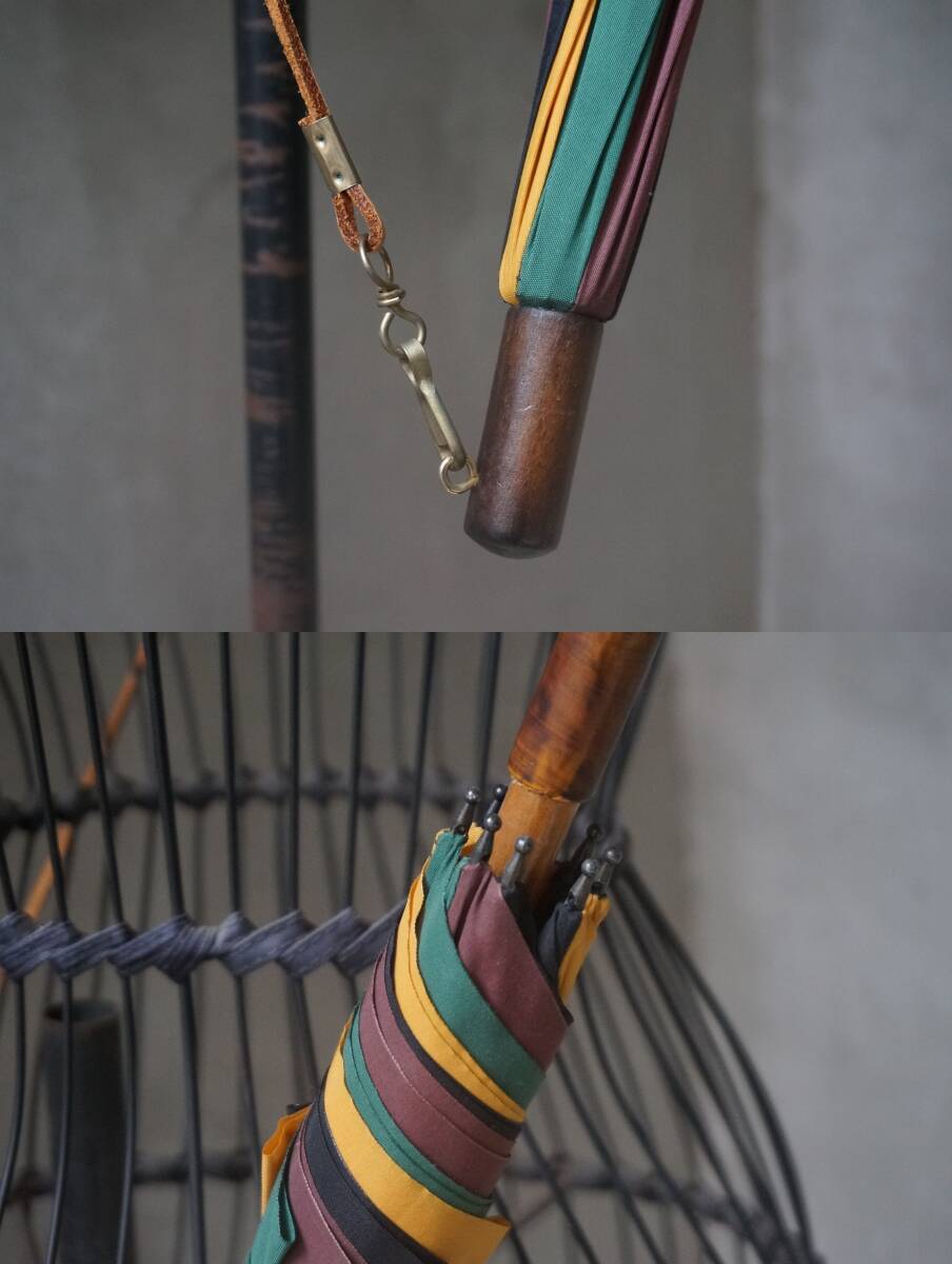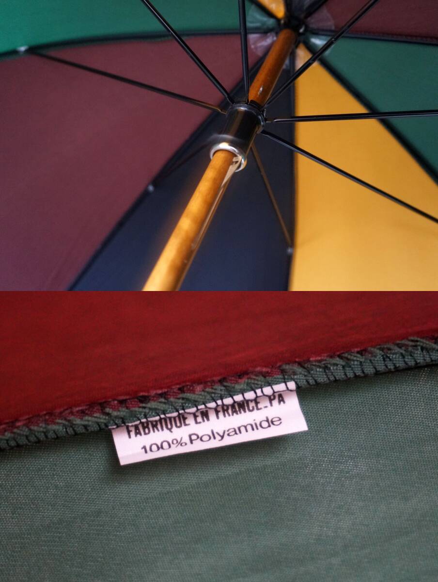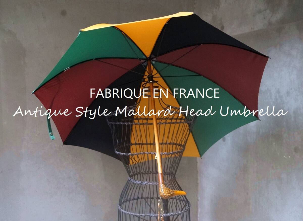 フランス製生地 ハンドメイド木製マラードヘッド アヒルハンドル 4色八枚ハギ ショルダーストラップ付 アンティークスタイル アンブレラ 傘