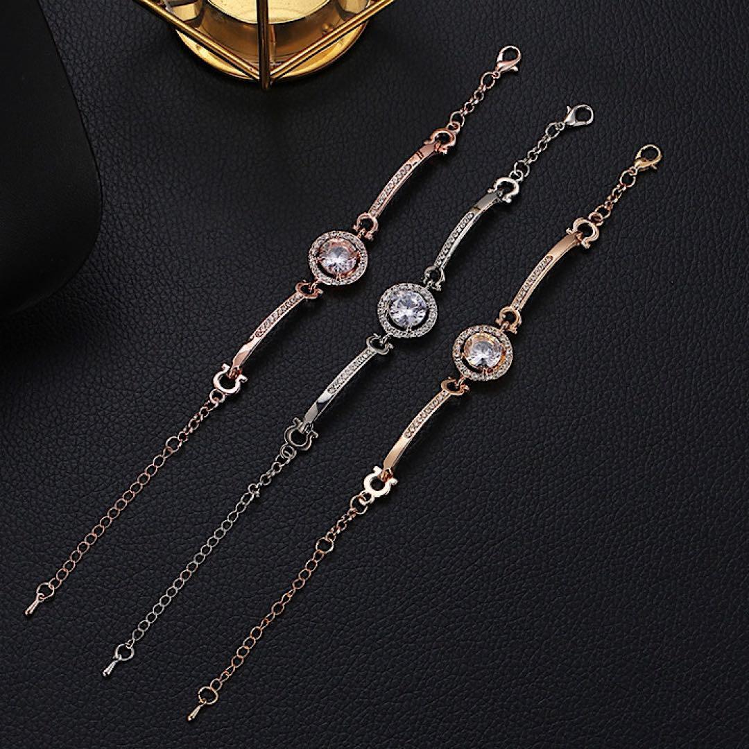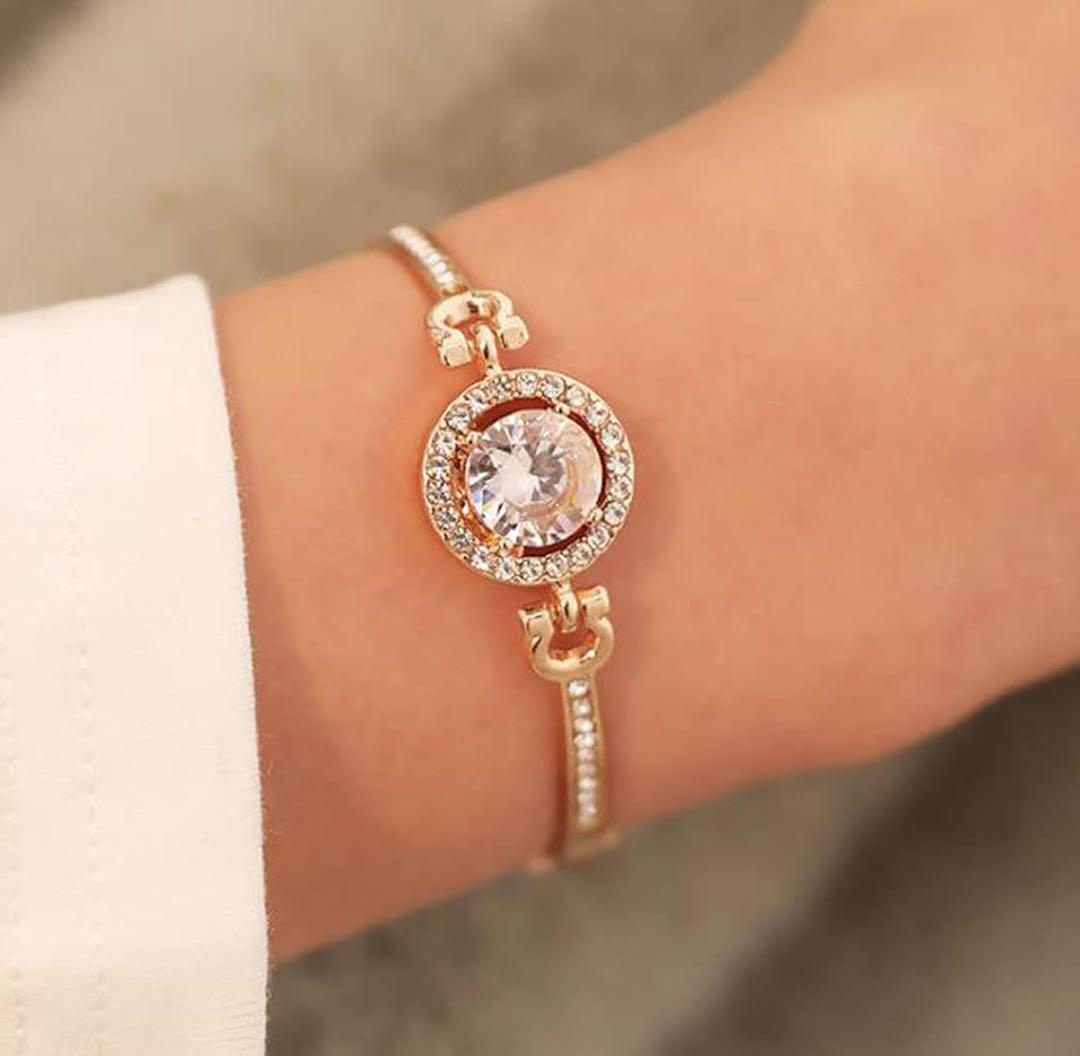 中央に大きめのストーンが輝き、小さめのストーンもライン状についているので、手首を華やかに見せてくれます。