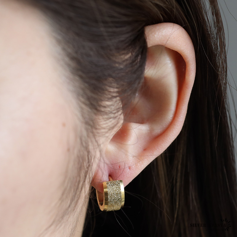 繊細な砂目の模様がキラキラと上品に輝くフープピアス。シンプルなフォルムに太めの幅がちょうどいい存在感に。普段使いや様々な場面で合わせやすいマストアイテムです。