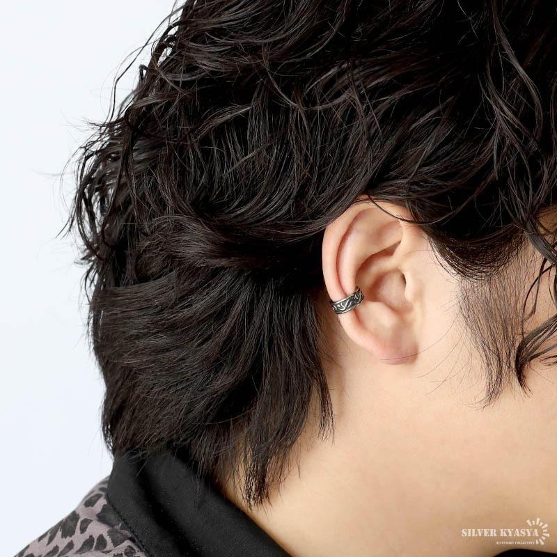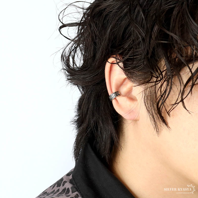 ユニークな唐草模様の入ったデザインのイヤーカフ。燻し風のブラック加工が映えるアイテムです。ピアスホール(耳の穴)不要で装着できます。