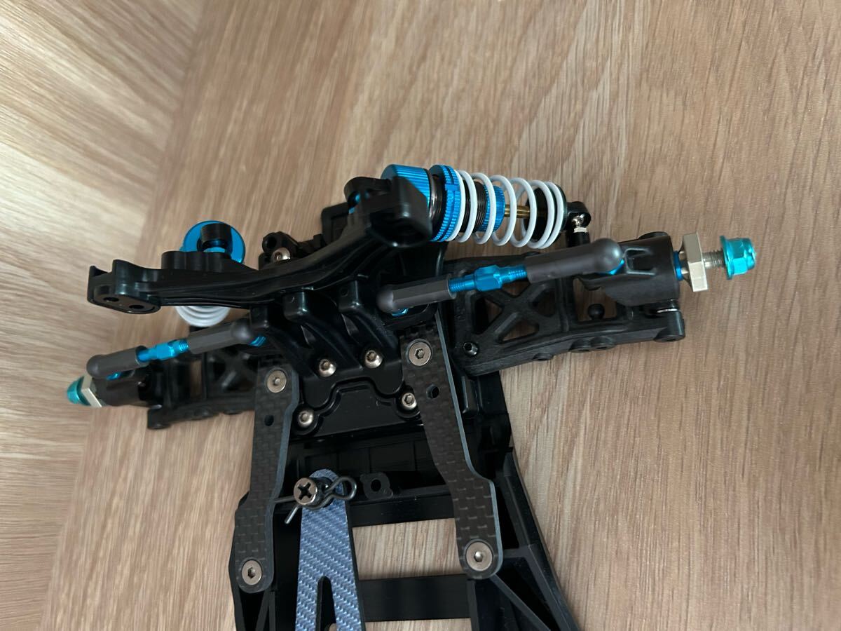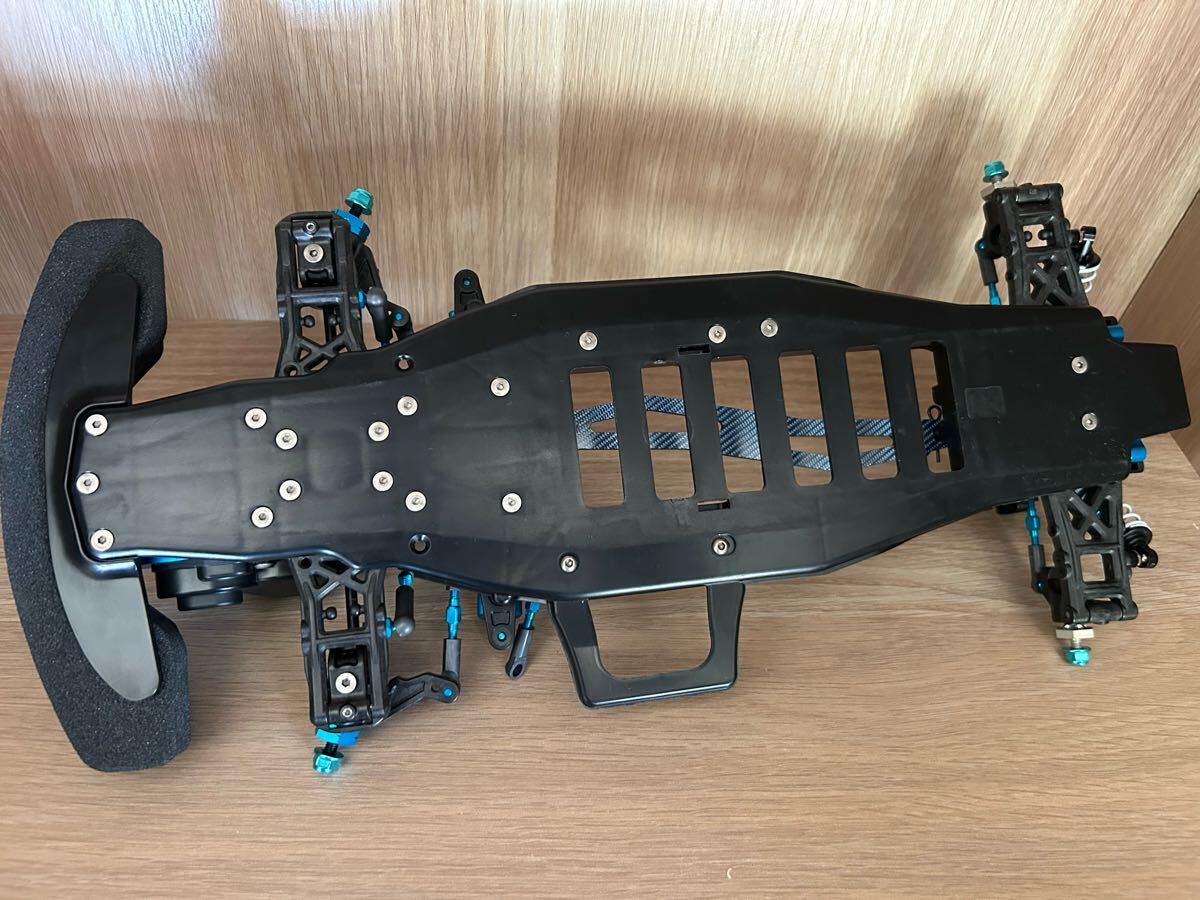 わかりづらいですがショートリバサス、前後アップライトなど足回りカーボン混入強化部品に交換済み。チタンビスで組んでます。