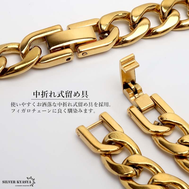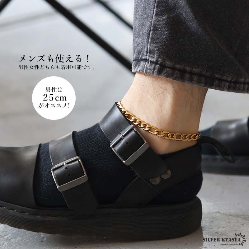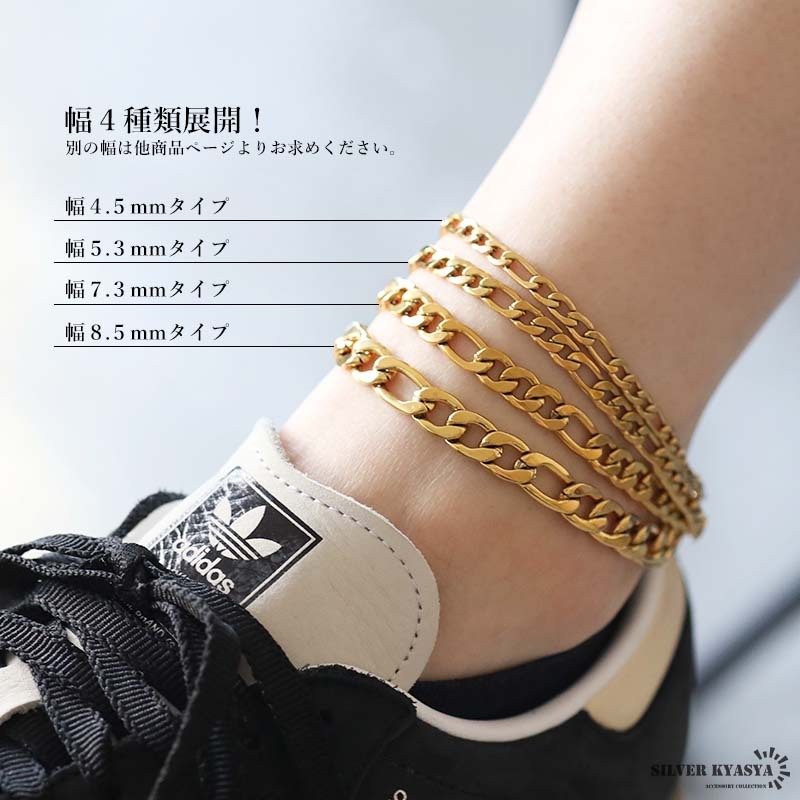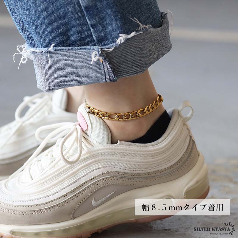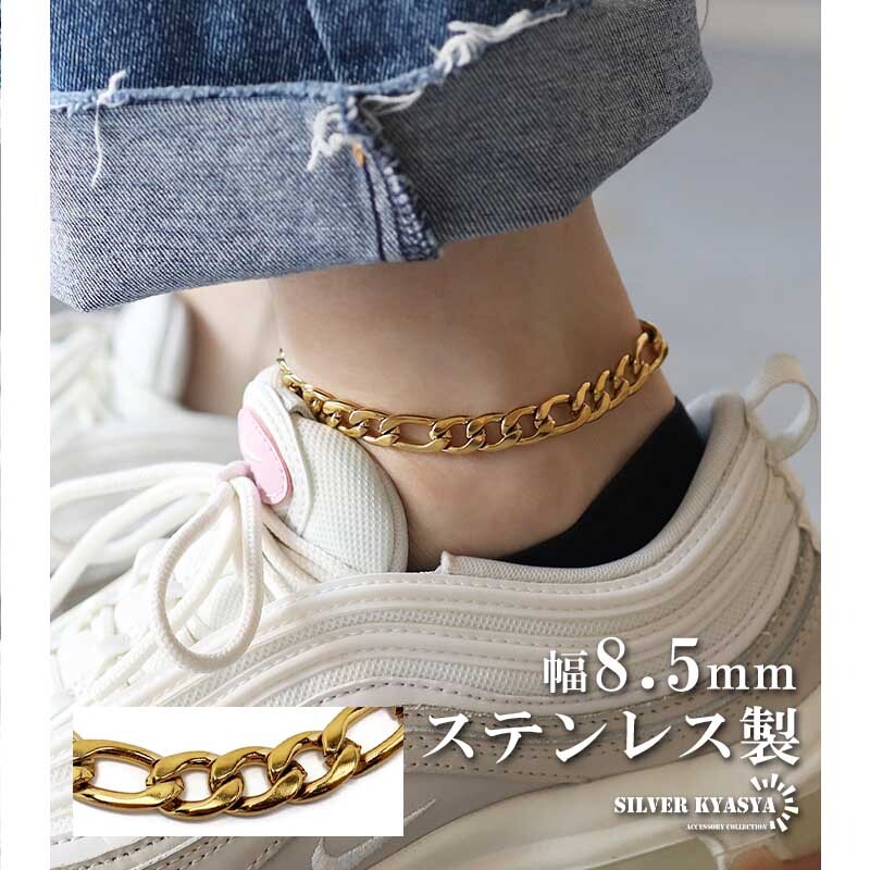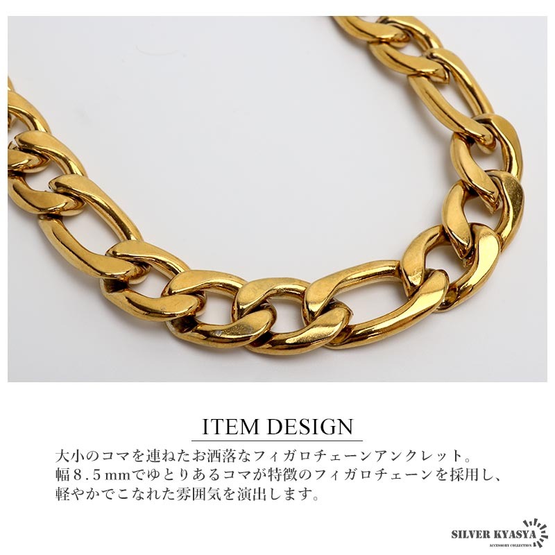 大小のコマを連ねたお洒落なフィガロチェーンアンクレット。幅8.5mmでゆとりのあるコマが特徴のフィガロチェーンを採用し、軽やかでこなれた雰囲気を演出します。
