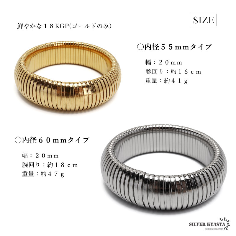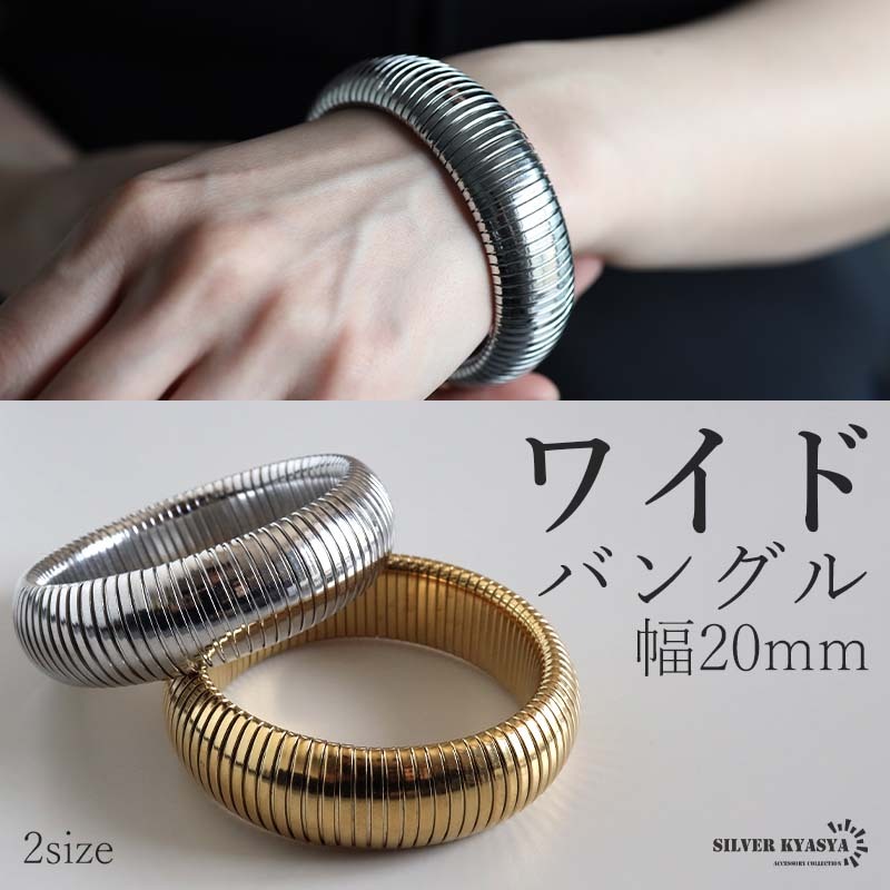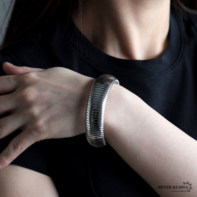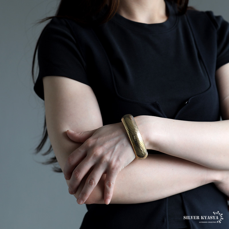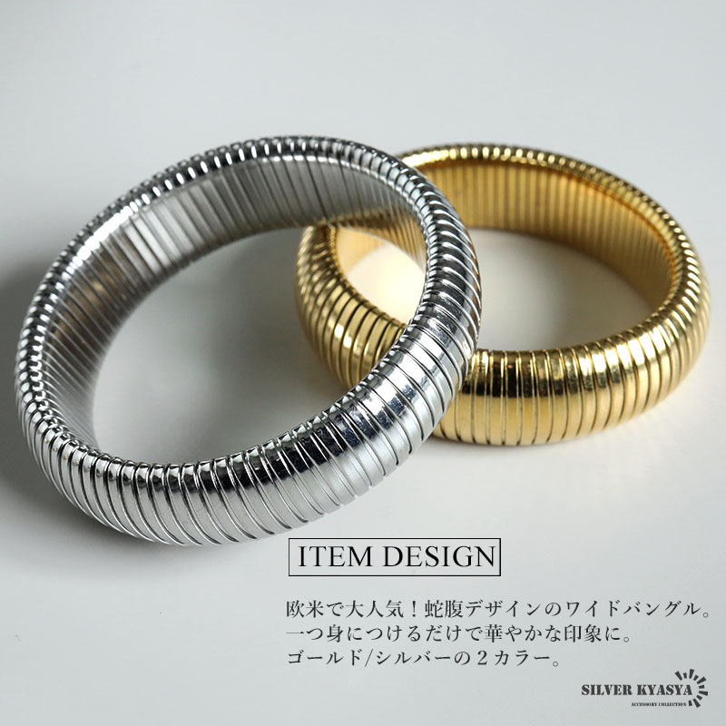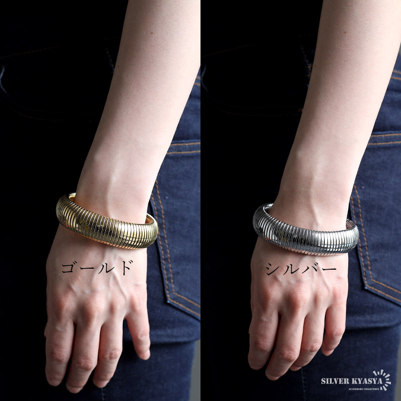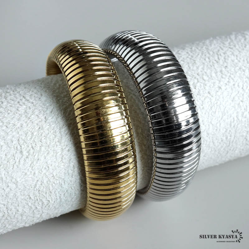 欧米で大人気!蛇腹デザインのワイドバングル。一つ身につけるだけで華やかな印象に。ゴールド/シルバーの2カラー。