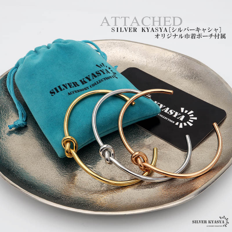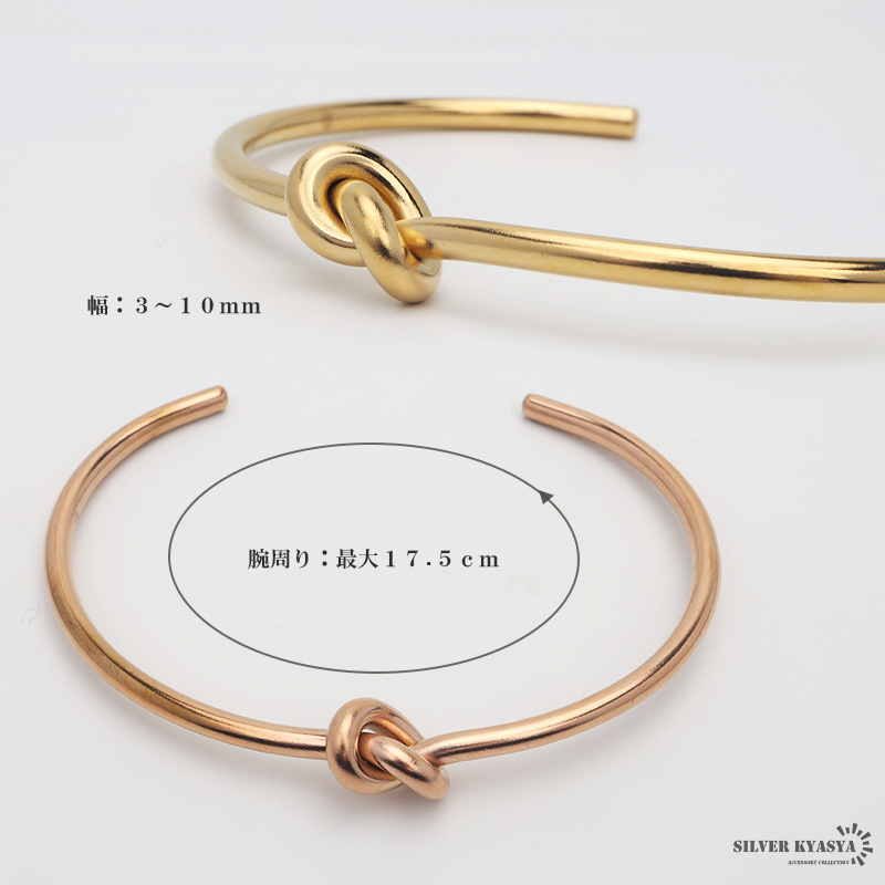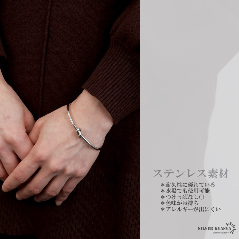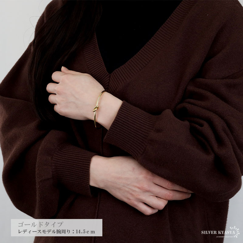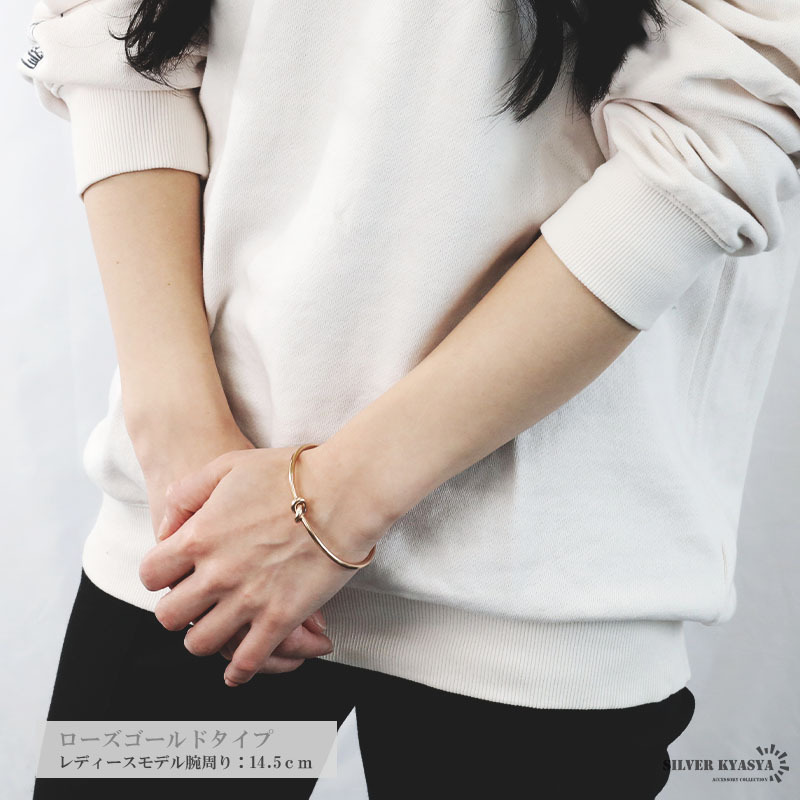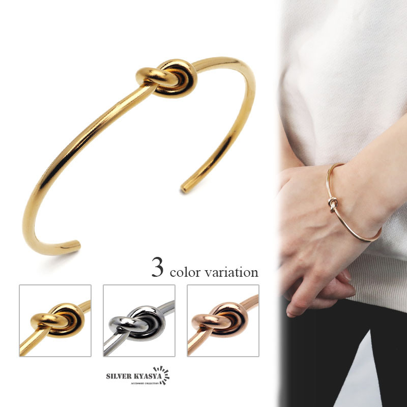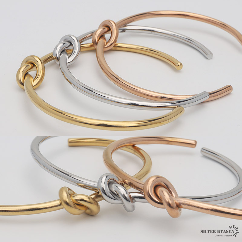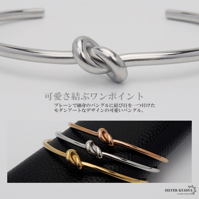 プレーンで細身のバングルに結び目を一つ付けたモダンアートなデザインの可愛バングル。ゴールド、シルバー、ローズゴールドの3カラーアイテムです。