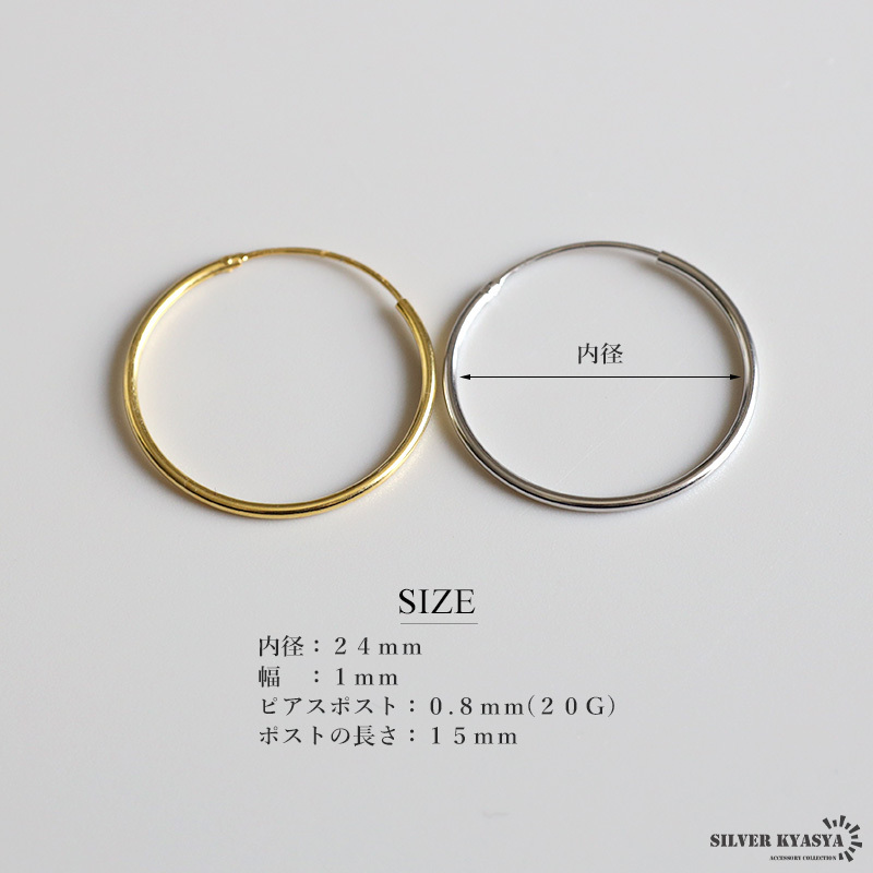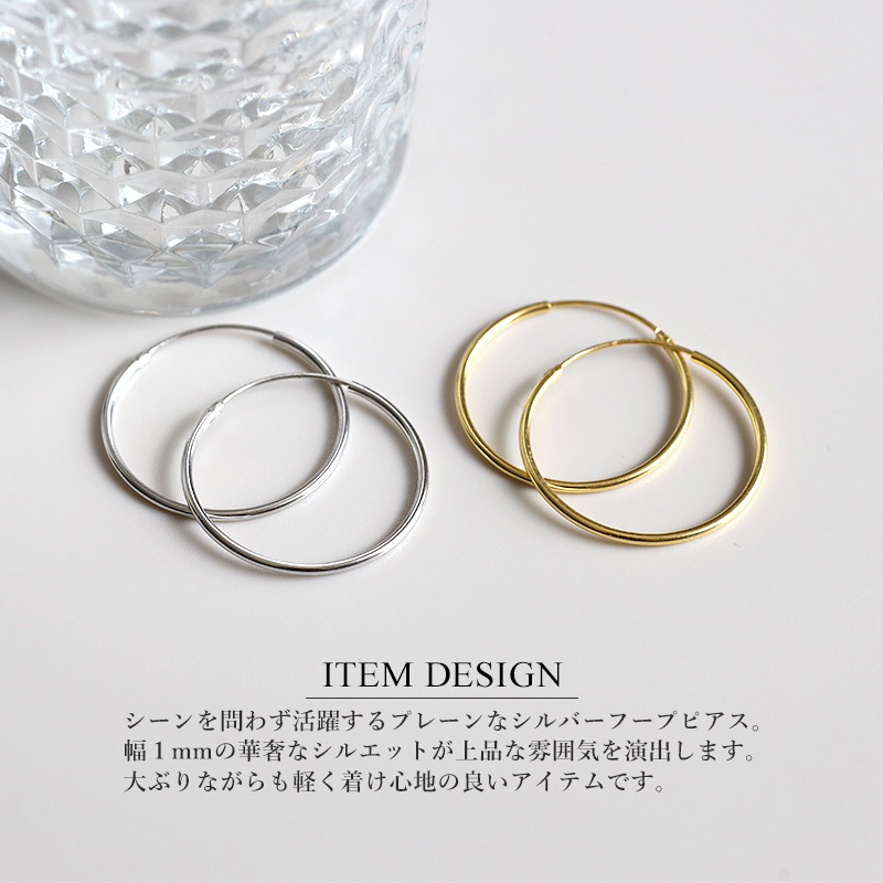 シーンを問わず活躍するプレーンなシルバーフープピアス。幅1mmの華奢なシルエットが上品な雰囲気を演出します。軽いつけ心地で普段使いにぴったりなアイテムです。