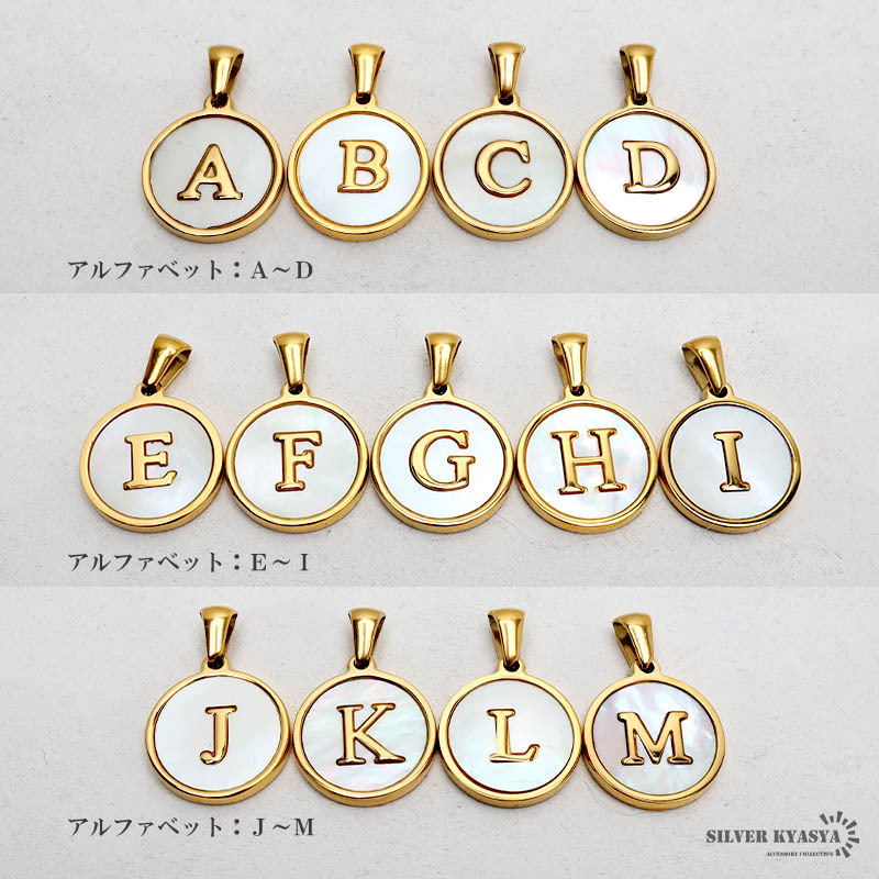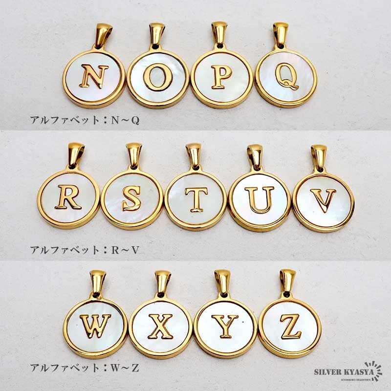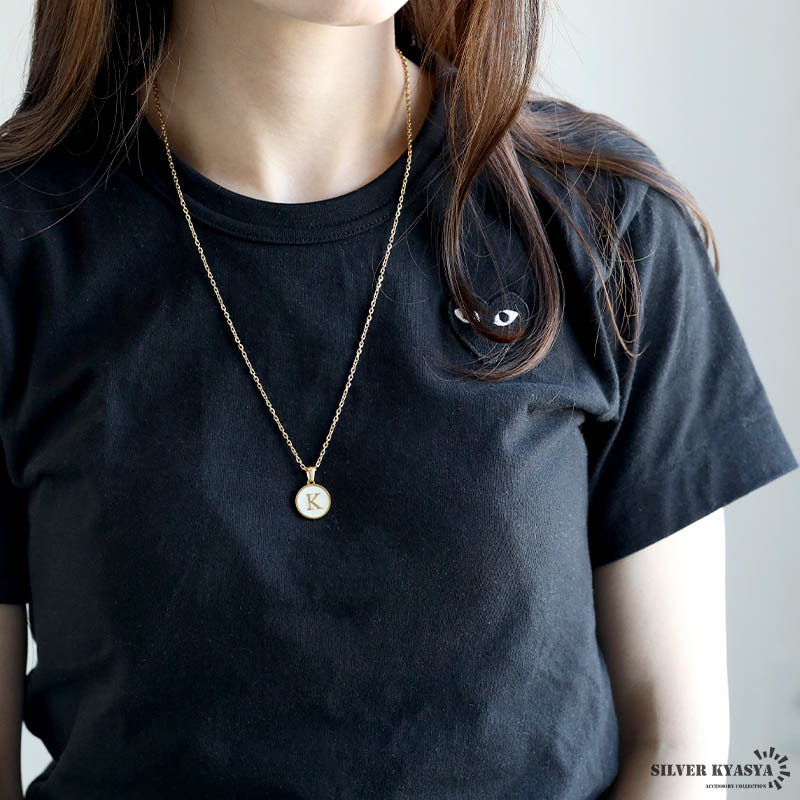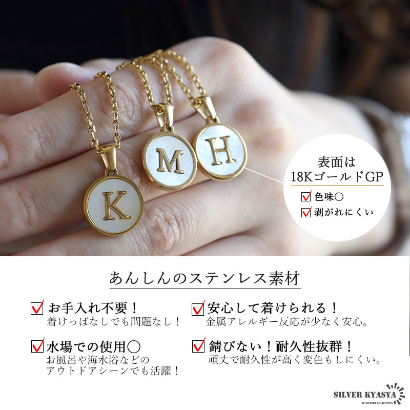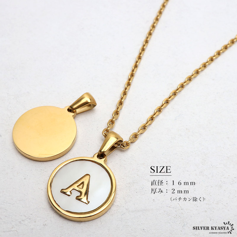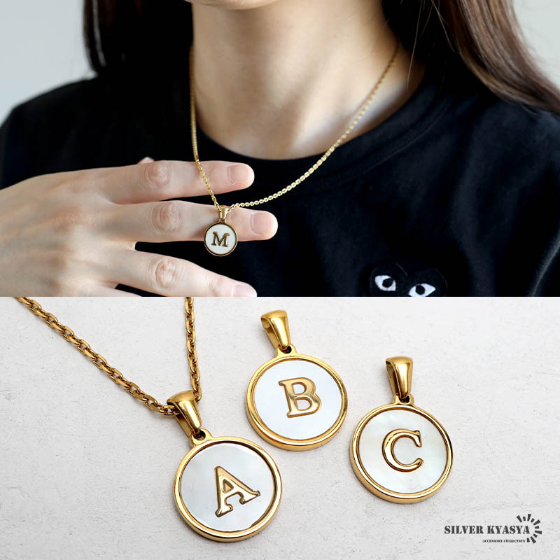 ラウンド型シェルプレートにアルファベットをあしらったネックレス。角度によってシェル特有の虹色の光彩が輝く美しいアイテムです。自分へのご褒美や、大切な人への贈り物にもおすすめの一品です。