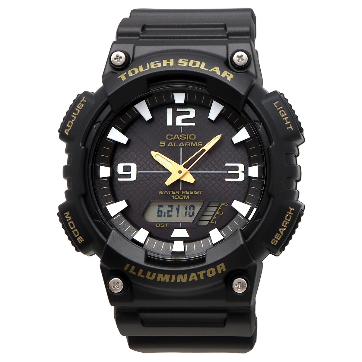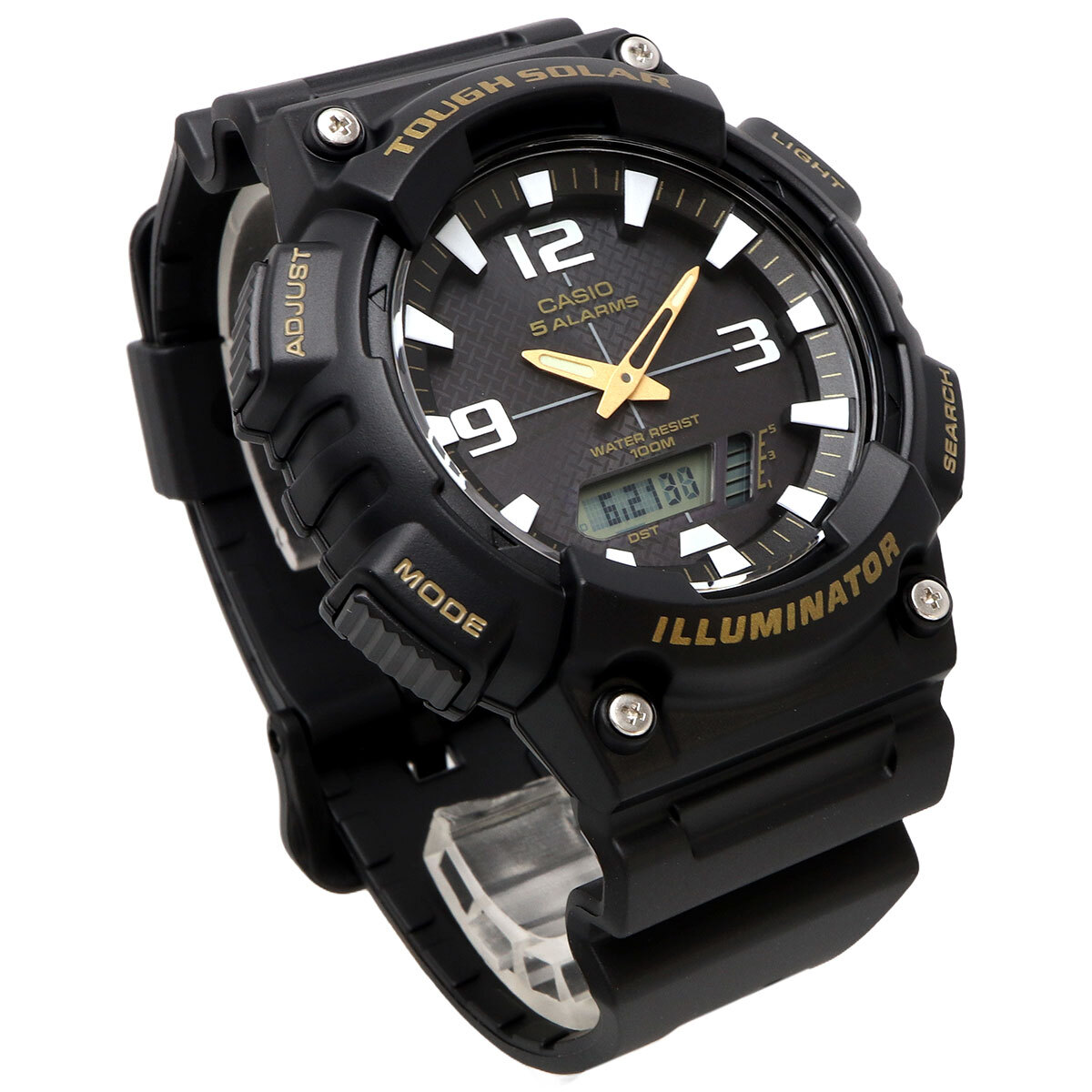 機能 | ● タフソーラー(ソーラー充電システム) ● ワールドタイム:世界48 都市(31 タイムゾーン、サマータイム設定機能付き)+ UTC(協定世界時)の時刻表示、ホームタイムの都市入替機能 ● ストップウオッチ(1/100 秒、60分計、スプリット付き) ● タイマー:最大2 セットの時間指定が可能なインターバル計測用のタイマー(セット単位:5秒、最大セット:99分55秒、 1 秒単位で計測、リピート(1~ 10回まで設定可能)機能付き) ● 時刻アラーム5 本・時報 ● バッテリーインジケーター表示 ● パワーセービング機能(暗所では一定時間が経過すると表示を消して節電します) ● フルオートカレンダー ● 12/24 時間制表示切替 ● 操作音ON/OFF 切替機能 ● 表示切替3 パターン(月日表示、時刻表示、曜日表示)、多言語曜日表示(6ヵ国語:英語/ポルトガル語/スペイン語/フランス語/ドイツ語/イタリア語) ● LEDライト(残照機能、残照時間切替(1.5秒/3秒付き)) ● 精度:平均月差±30秒 ● フル充電時からソーラー発電無しの状態での駆動時間 ● 機能使用の場合:約10ヵ月 ● パワーセービング状態の場合:約23ヵ月 | |||||||||||||||||