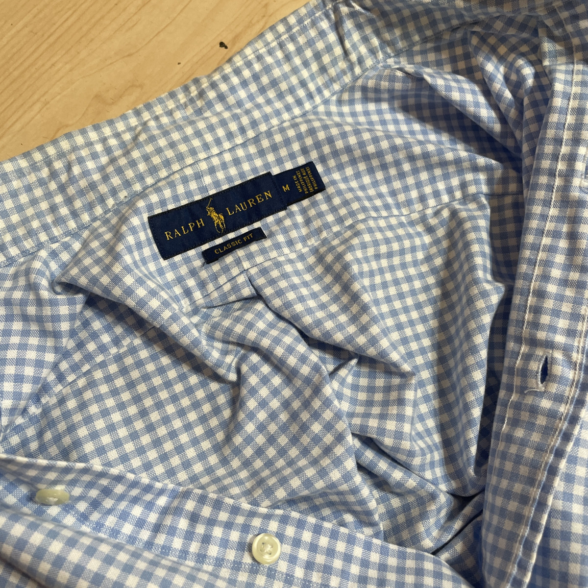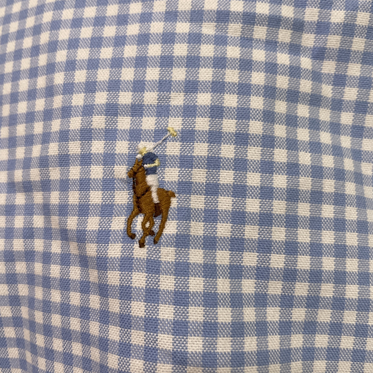 ポロラルフローレンの水色のチェック柄で、ポロ馬の刺繍が施された長袖シャツ。