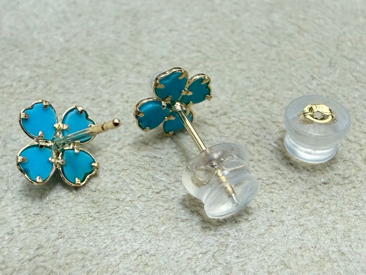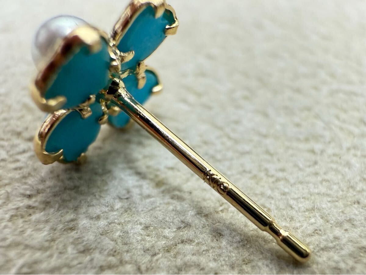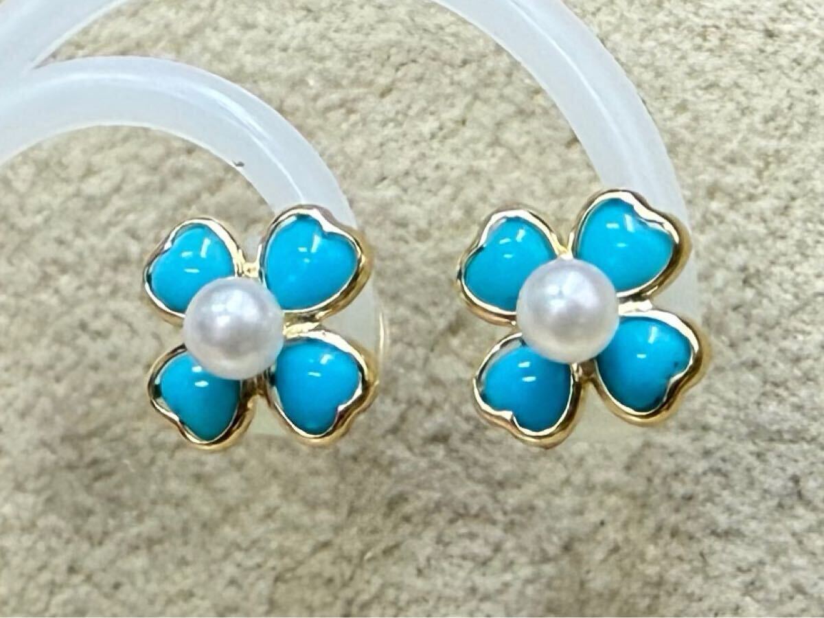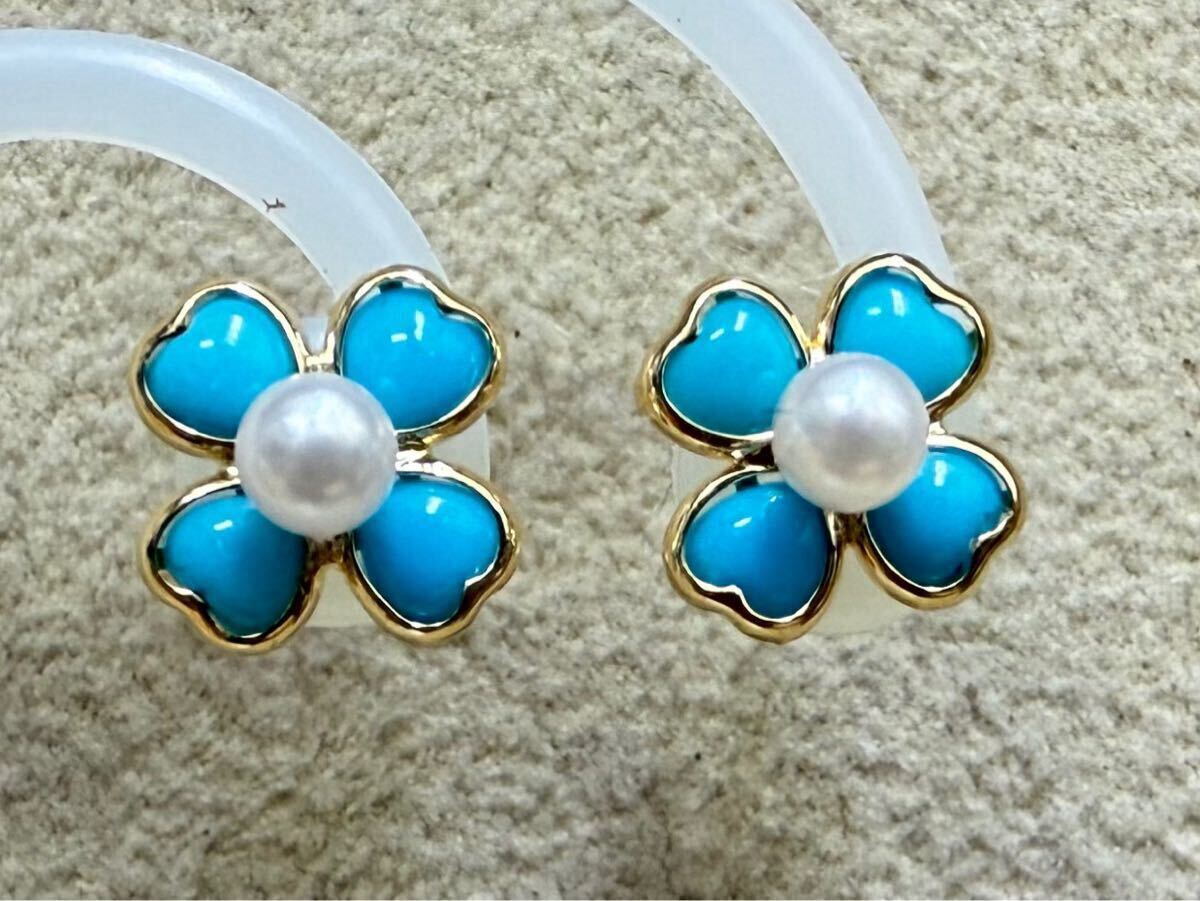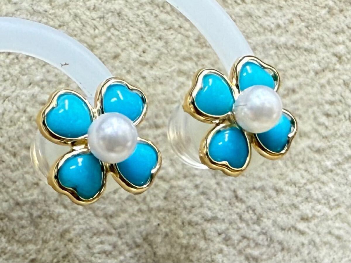 縁起物の四つ葉のクローバーモチーフなトルコ石とパールのピアスです。