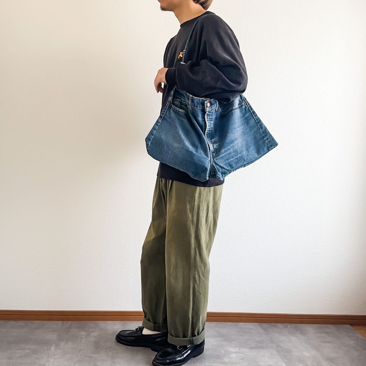 なかなかデニムパンツをリメイクしたバッグは見ないかと思いますのでコーディネートのアクセントになるかと。