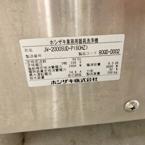 【業界最長1年保証】食器洗浄機 ホシザキ JW-2000SUD-P 業務用 中古/送料無料