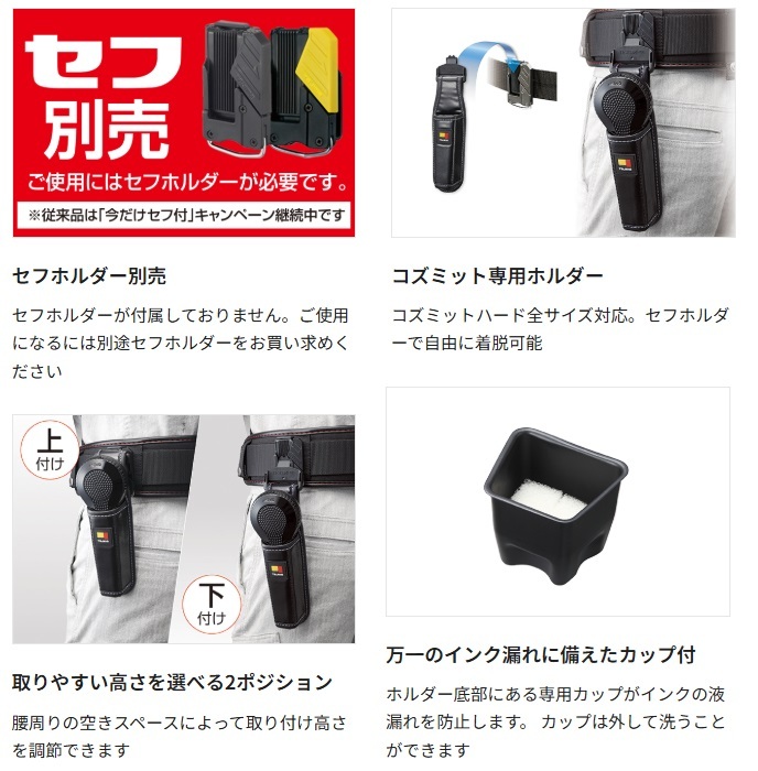 万一のインク漏れに備えたカップ付きボトム(取り外し可)セフホルダーで自由に着脱可能です。(セフ別売)