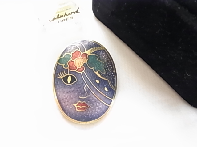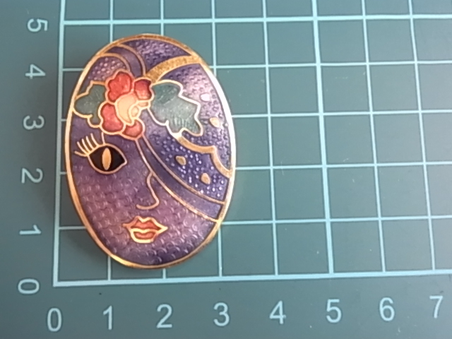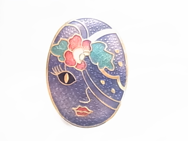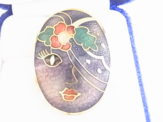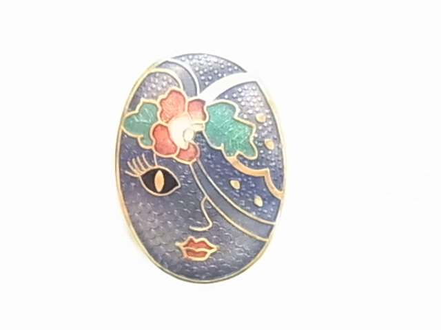 ビンテージ/ヴィンテージ 楕円形 焼き物系 七宝焼き? 手書き美人調 女性の顔がモダンで素敵 個性的なデザインの素敵スカーフ留め△