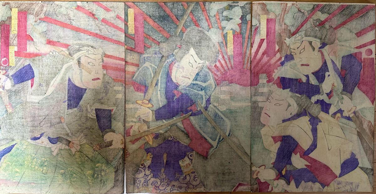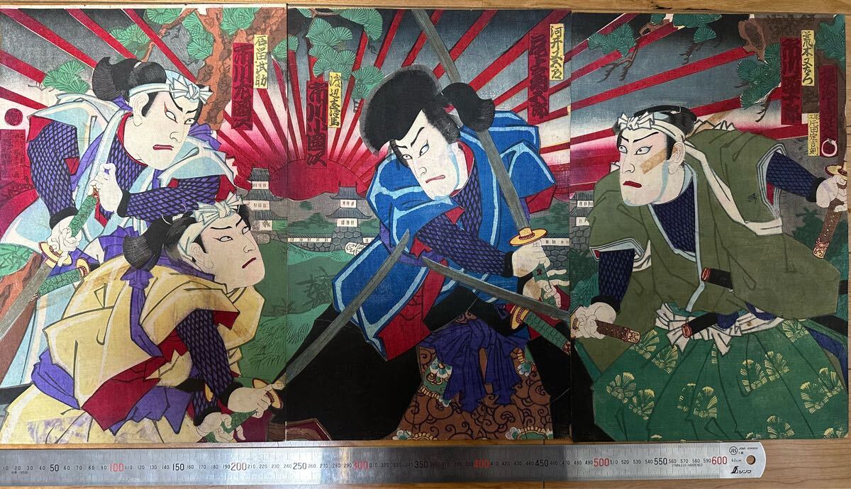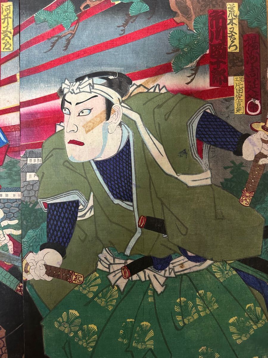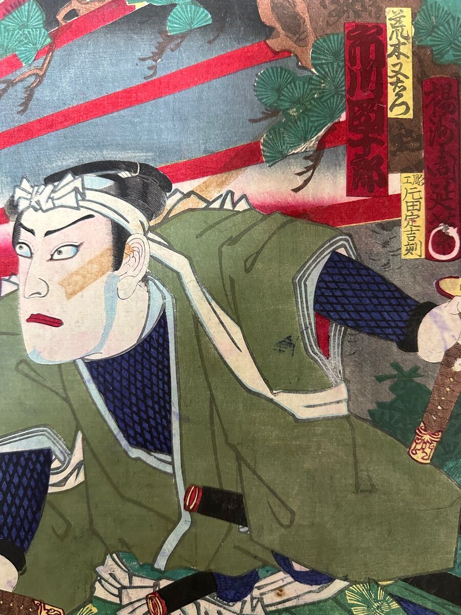 【真作】明治期 本物浮世絵木版画 楊洲周延「市川團十郎 市川小團次 市川團次」役者絵 芝居絵 大判 錦絵 保存良い 三枚続き