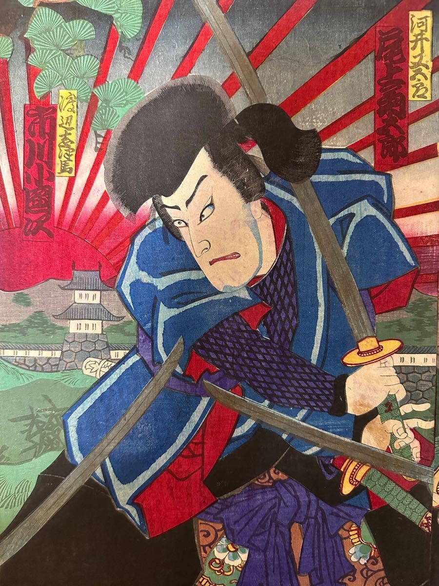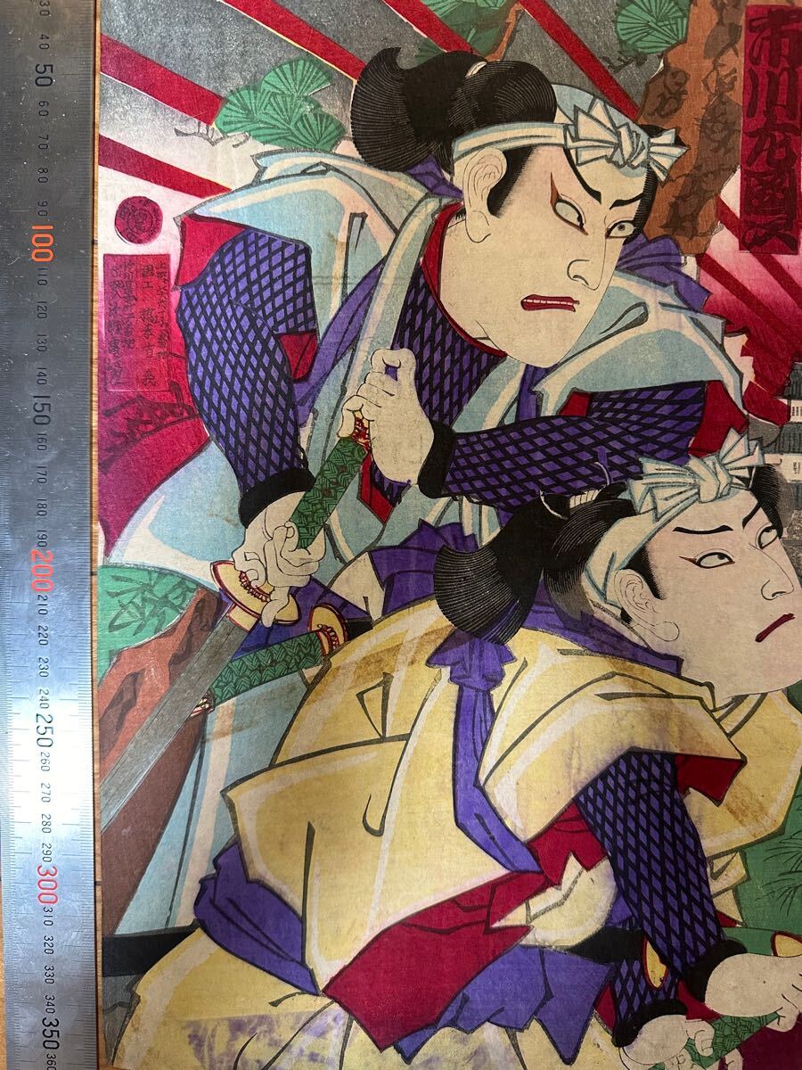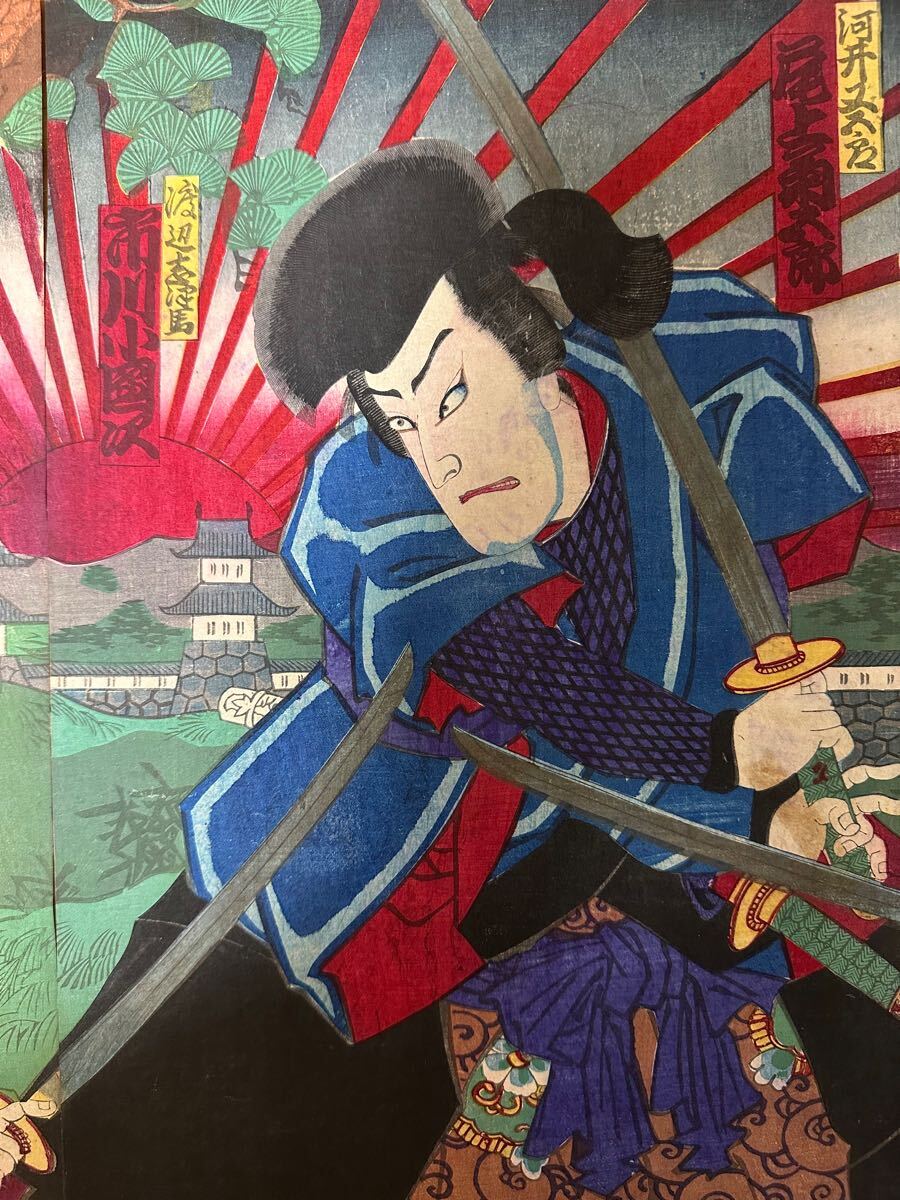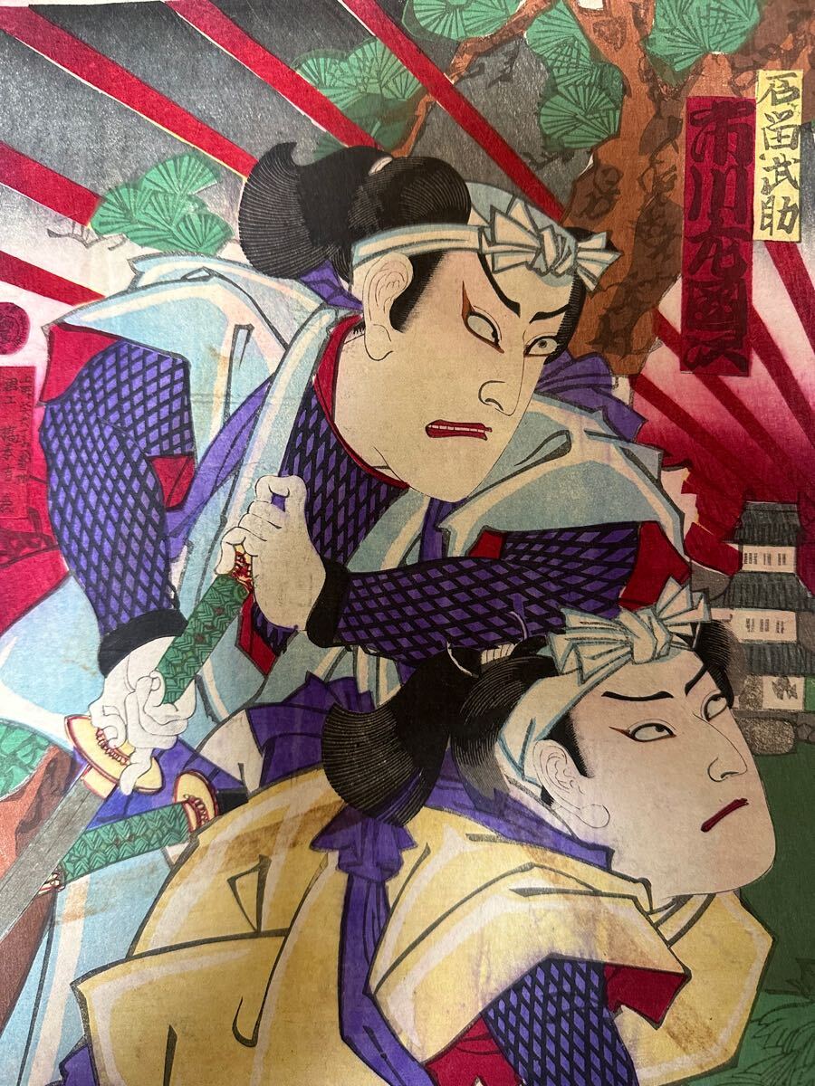 【真作】明治期 本物浮世絵木版画 楊洲周延「市川團十郎 市川小團次 市川團次」役者絵 芝居絵 大判 錦絵 保存良い 三枚続き