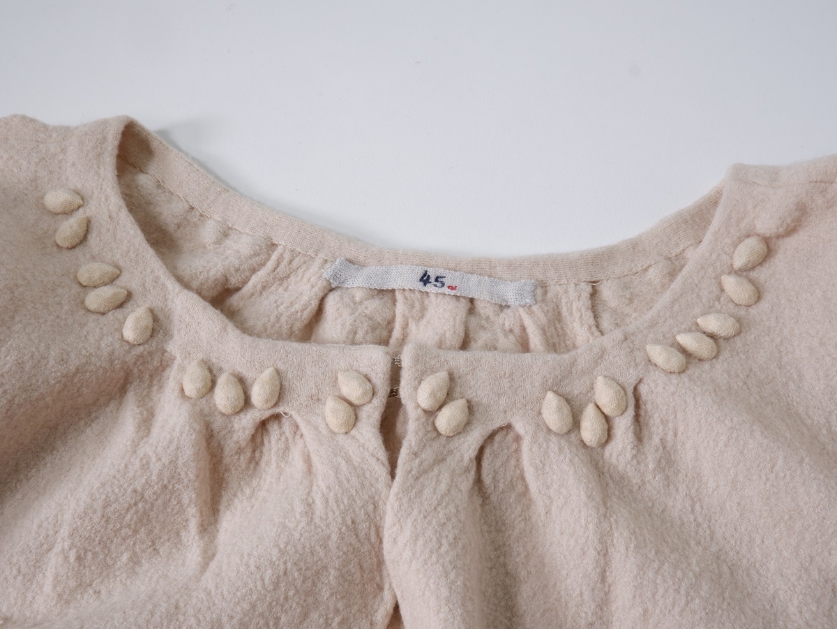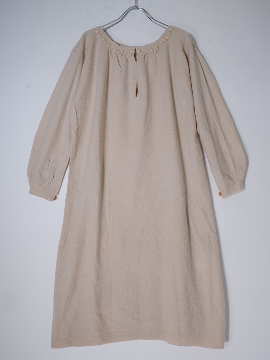 【素材感】柔らかな縮絨ウール地 【透け感】なし 【裏地】なし 【ストレッチ】なし 【開閉デザイン】首元ホック 【付属品(取り外し可)】なし 【商品情報】定番の縮絨ニットのワンピース。膝ににかかるほどの着丈で広めのシルエット。前あき部分には小さなカギフックがついています。ネックや袖口にゆるめのタックをいれたことで、より女性らしいやわらかな印象になりました。ポイントは、ネックに描いたお花の刺繍です。ぽこっと浮きでた部分の中身はビーズ。ビーズを同生地で包みこみ、1つ1つ丁寧にハンドステッチでつけました。 |