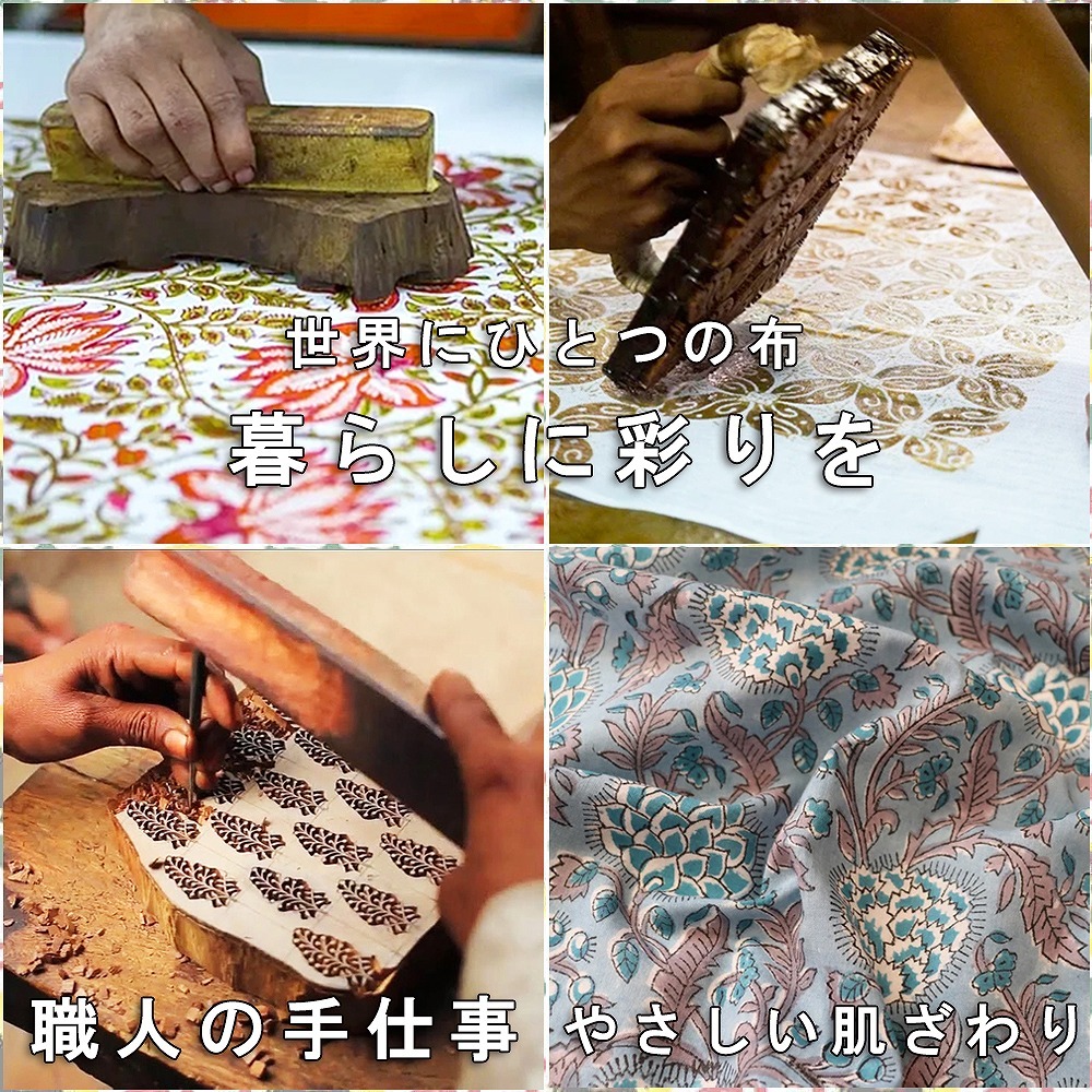 インド伝統の染色技法。職人が手彫りの木版を使い、布に模様を押し染めます。機械では出せない、独特の風合いと温かみが魅力です。