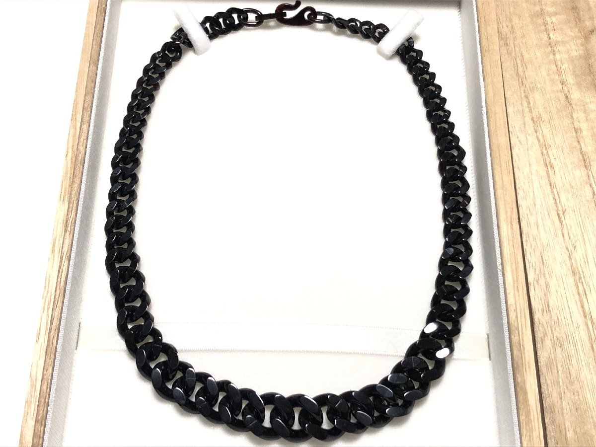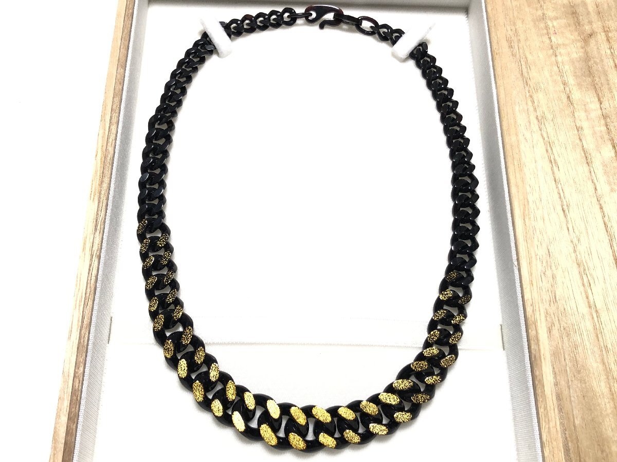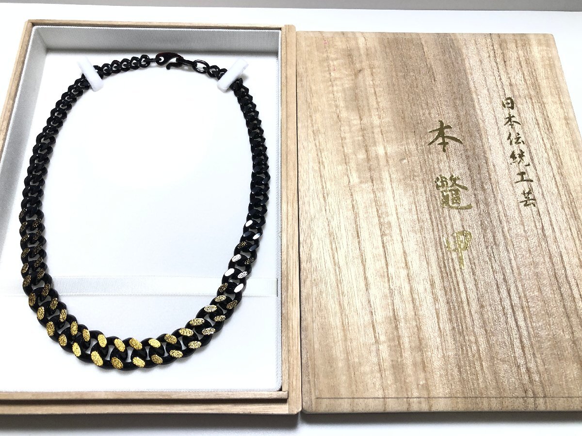 アンティークの黒甲の本鼈甲を使用し、金箔細工を施した、喜平デザインのネックレスです。鼈甲部分に欠けや虫食いは無く、美品です。共箱付属です。