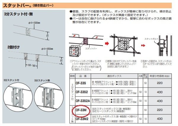 ▽ 未来工業 OF-35S 3分スタット付ニュースタットバー 傾き防止バー (50個入り)