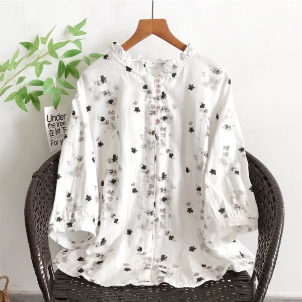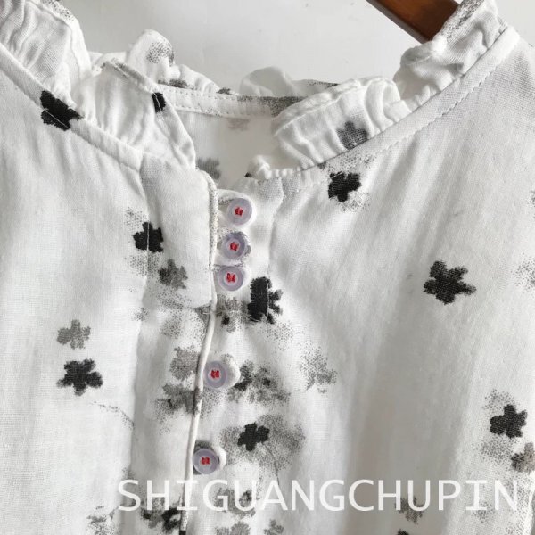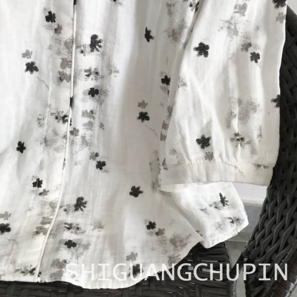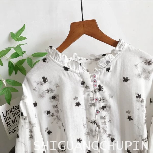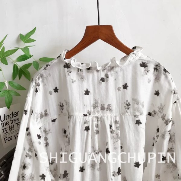 sg プリント花柄 フリーサイズ ワイシャツ チュニック トップス ダブルガーゼ 綿100%コットン 大人可愛 ナチュラル ホワイト