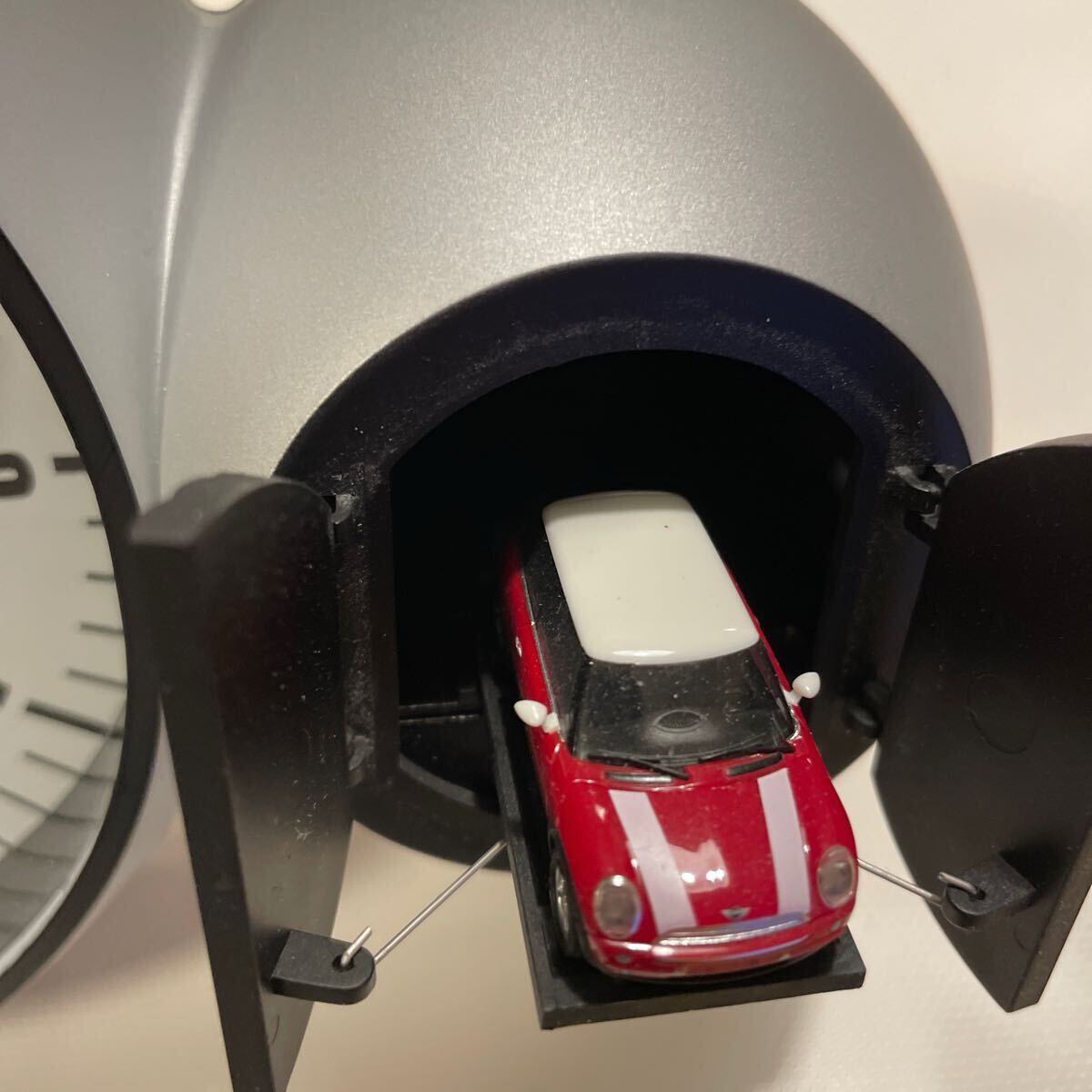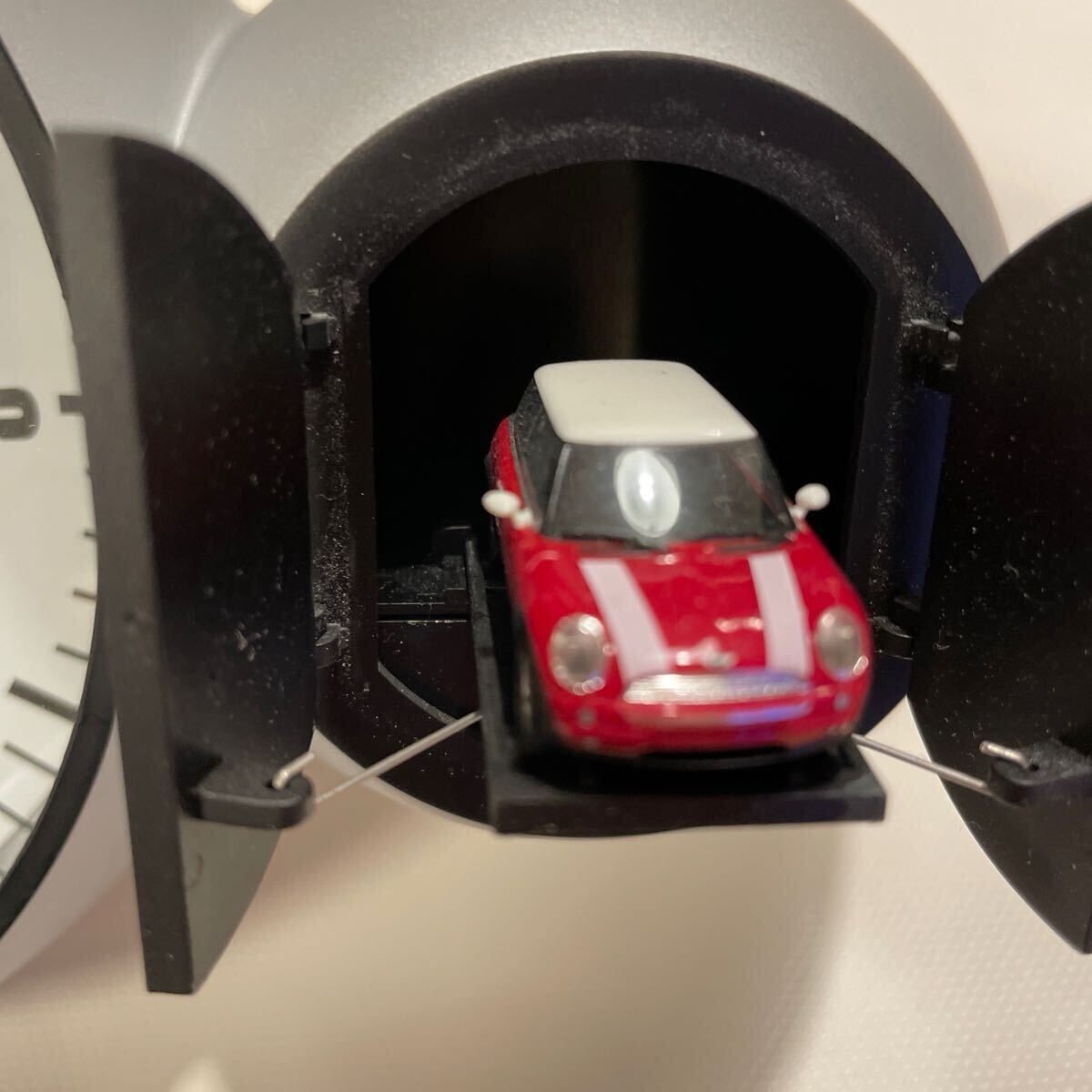 MINI BMW 純正アクセサリーのミニ クーパー クロック 壁掛け時計 ハト時計様 からくり時計 長針が12時になるとガレージから赤いミニが飛び出でエキゾースト,クラクション音がする仕掛けになります。